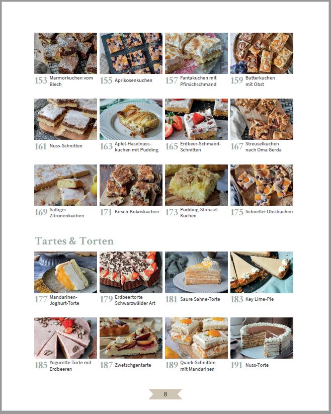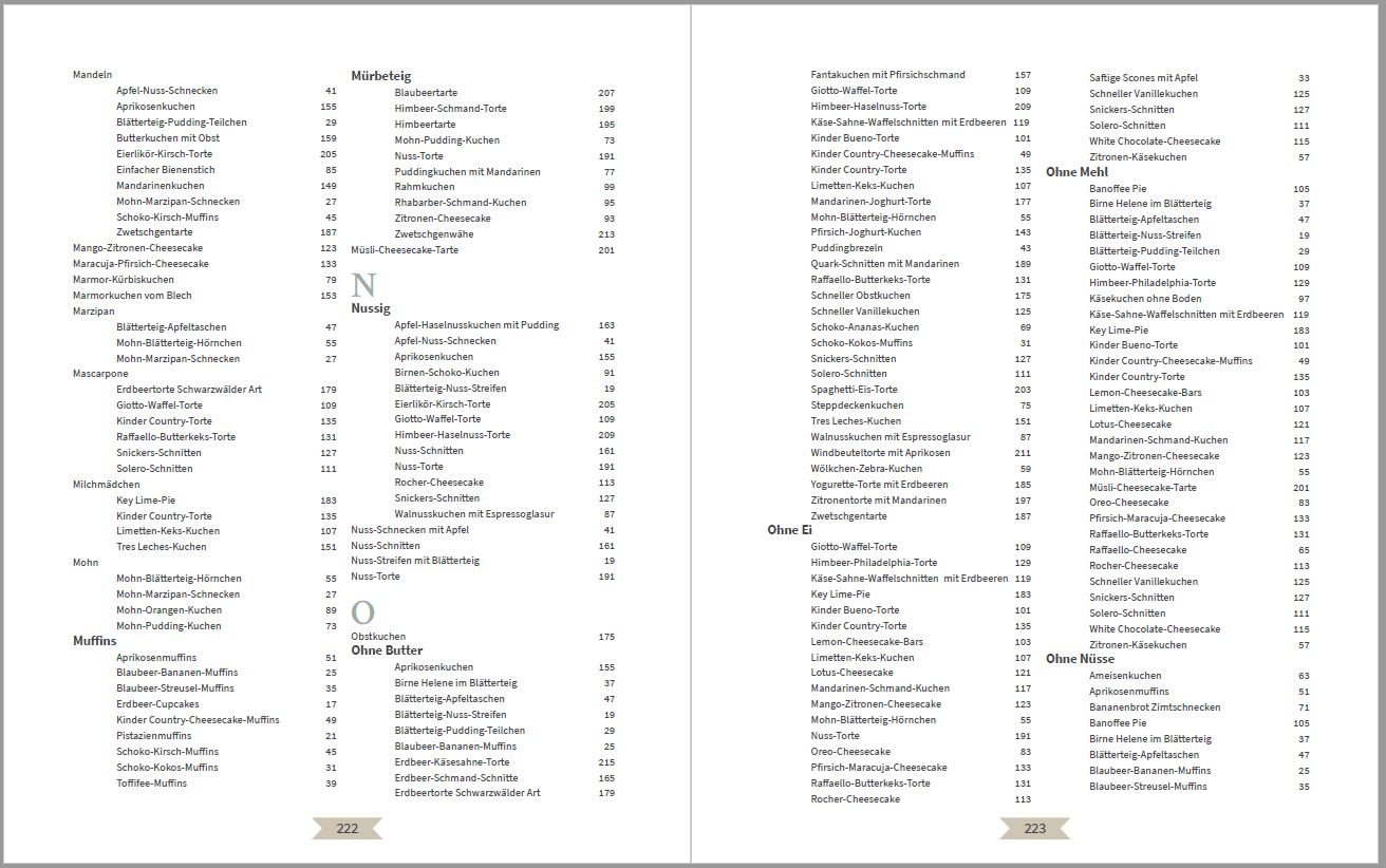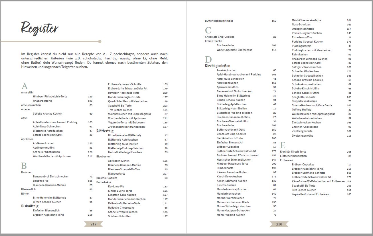 → Umfangreiches Register mit vielen Suchfunktionen (ohne Mehl, ohne Butter, fruchtig, nussig, schokoladig, schnell gemacht, etc.)
