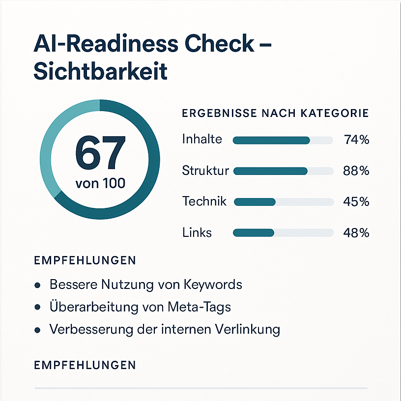 Mit dem AI-Readiness Check prüfe ich, ob deine Website oder dein Content heute schon die Voraussetzungen erfüllt, um von KI-Systemen überhaupt erkannt, verarbeitet und empfohlen zu werden.