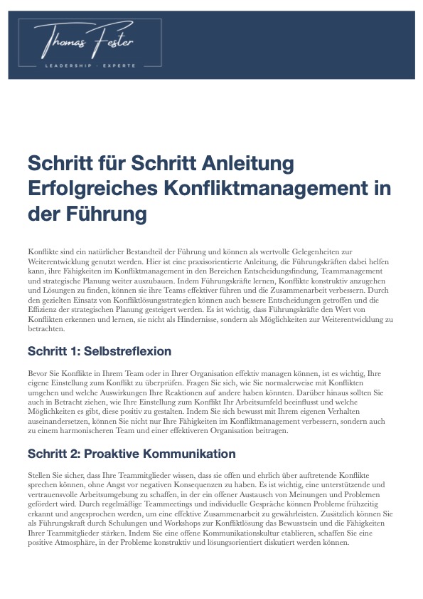 Der Leitfaden "Erfolgreiches Konfliktmanagement in der Führung", ist ein unverzichtbares Instrument für Organisationen und Führungskräfte, die Konflikte effektiv bewältigen und ihre Führungsfähigkeiten auf das nächste Level heben möchten.In diesem umfassenden Leitfaden verbindet sich langjähriges Wissen und tiefgehende Expertise in den Bereichen Führung und Konfliktmanagement. Mein Ziel ist es, angehende Führungskräfte genauso wie erfahrene Manager dabei zu unterstützen, Konflikte innerhalb ihrer Teams erfolgreich anzugehen und zu bewältigen.