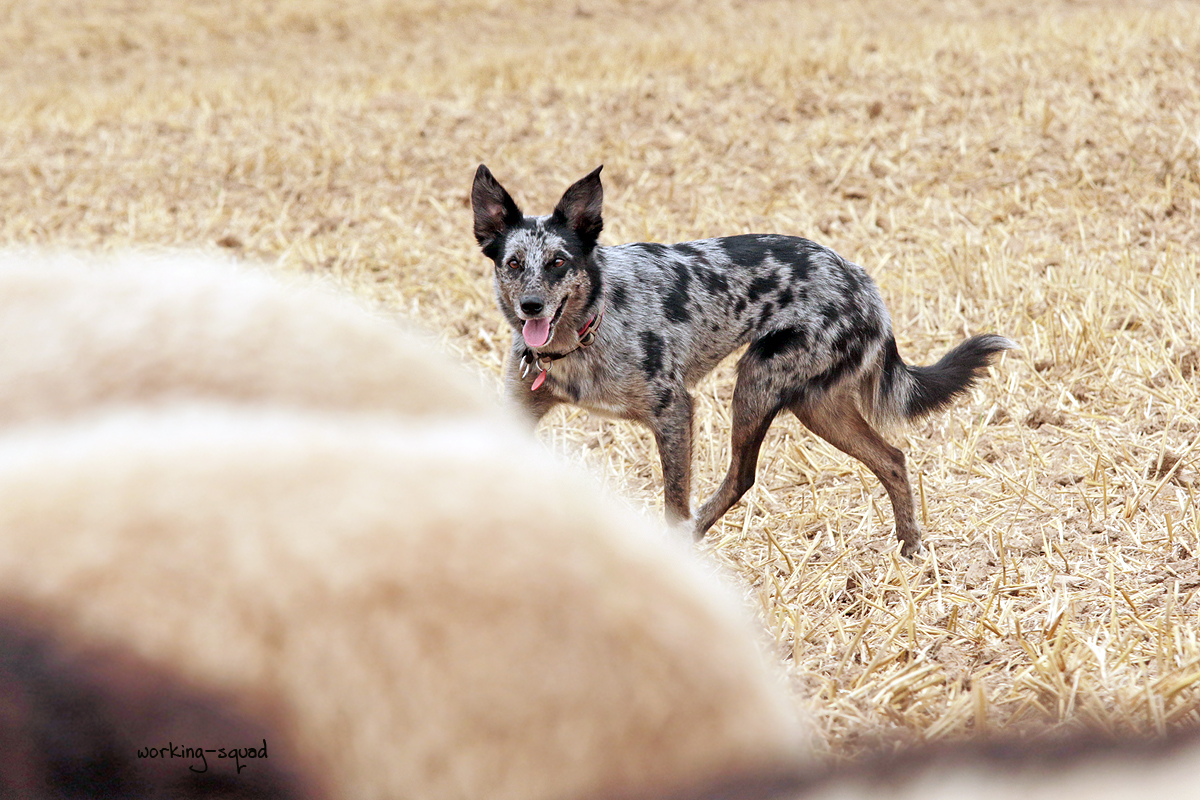 Warum ich das so ausführlich beschreibe? Tatsächlich ist es so, dass Fleek an den Schafen eher nach einem Koolie kommt. Diese Rasse ist den Border Collies sehr ähnlich, arbeitet aber mit "losem Auge". Und genau das ist bei Fleek der Fall. Sie ist ein "loose eye dog" bei der Arbeit. Sie bleibt also nicht automatisch in stylisher Körperhaltung mit ihren Augen an den Schafen "hängen". Ansonsten "funktioniert" sie aber genau wie meine Border Collies und auch die Ausbildung für die alltägliche Arbeit und später eventuell auch den Hütesport unterscheidet sich nicht in den grundlegenden Schritten zu denen bei der Ausbildung meiner Border Collies.