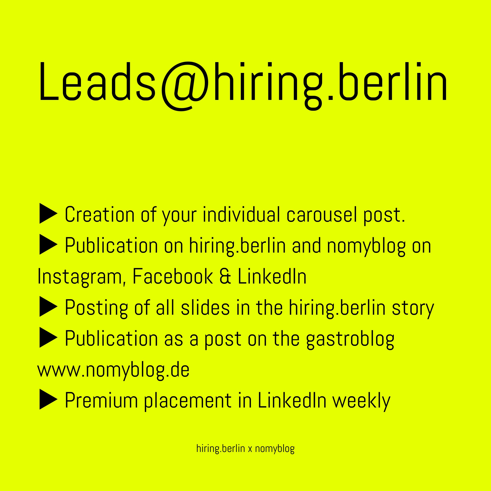 It appears on both hiring.berlin channels and on nomyblog, the trade magazine for the restaurant industry with a focus on Berlin.
