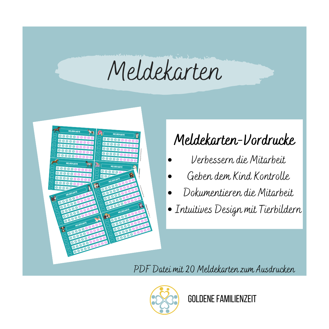 Die Datei beinhaltet 20 einzelne Meldekarten mit unterschiedlichen Tiermotiven, die dein Kind ausschneiden und je nach Geschmack: