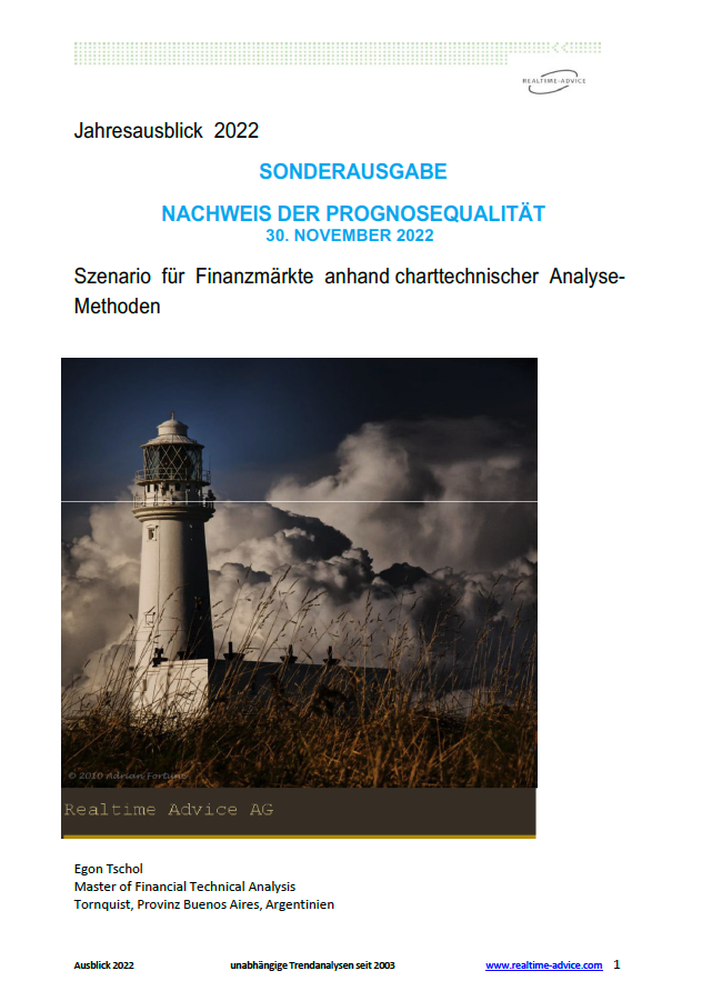 Der Jahresausblick mit seinen Verlaufs-Prognosen für Indizes, Zinsen, Währungen und Rohstoffe ist bereits zur Tradition geworden. Anders als bei den meisten verfügbaren Prognosen bezieht meine Art der Darstellung den zeitlichen Verlauf und die Dynamik ein und ist somit einzigartig. Der Jahresausblick ist als Leitfaden für meine Leser gedacht, um das grosse Bild nicht aus den Augen zu verlieren. Es handelt sich um wahrscheinliche Szenarien aus meiner Sicht, die sich aus der Kombination diverser Chart-Analyse-Instrumente, Intermarket-Analyse und nicht zuletzt aus Erfahrung und Intuition ergeben. Den grössten Nutzen erzielt er in Bezug zu den wöchentlichen Chart-Reports, welche objektiv mit Hilfe des Trendphasen-Ansatzes die jeweiligen Prognosen verifizieren oder anpassen. Die vorliegende Sonderausgabe zeigt auf, wo die Prognosen besonders gut in 2022 eintrafen (Zinsen, Aktien, einige Rohstoffe) aber auch, wo es Abweichungen zur Prognose gab (EUR/USD). Für mich ist dies auch eine unverblümte Selbstreflexion, um in Zukunft noch mehr Treffer im Schwarzen zu landen. Es würde mich freuen, wenn Sie in 2023 wieder Teil der Leserschaft sein werden. Frohe Festtage und einen guten Rutsch!