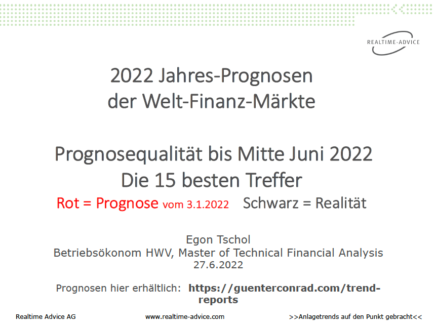 Hier finden Sie den aktuellen grafischen "Soll/Ist" Vergleich für 15 der 23 Werte aus den 2022 Jahresprognosen von Egon Tschol, RealTime Advice AG.