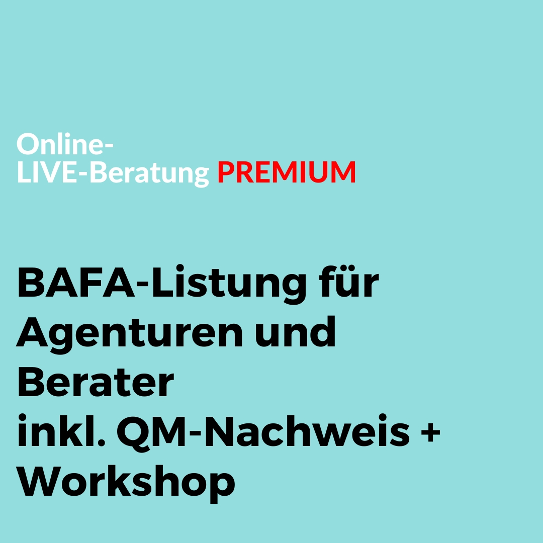 Deine Vorteile auf einen Blick:Im Modell Premium bekommst du von mir praxiserprobte Vorlagen und einen klar strukturierten Leitfaden, damit du genau weißt, was wann zu tun ist – ohne Rätselraten und Rückfragen vom BAFA. Zusätzlich bekommst du die komplette Unterstützung durch 1:1 Coachings. Das Besondere: Das Angebot umfasst einen BAFA-konformen Qualitätsnachweis (individuell aufbereitet auf Basis deiner Angaben) sowie drei Stunden 1:1-Coaching zur strategischen Ausrichtung und Kundengewinnung.