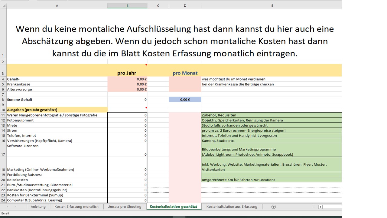 Endlich kannst du deine Kosten ermitteln und dadurch deine Preise kalkulieren. In dieser EXCEL Tabelle sind neben Anleitungen und Hinweisen verschiedene Möglichkeiten der Berechnung deiner Preise gegeben.