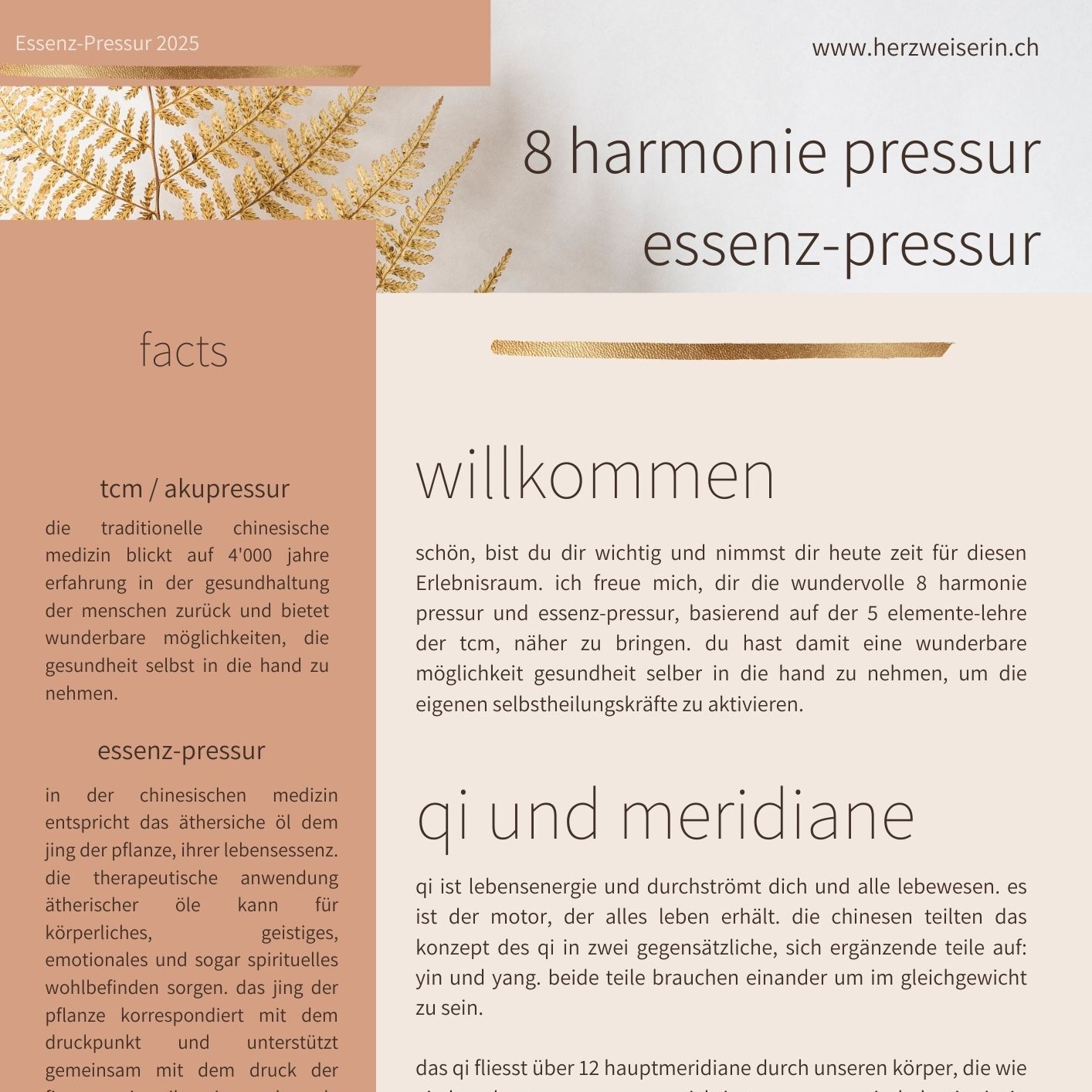 Mit diesem 22 seitigen Skript bekommst du eine Schritt für Schritt Anleitung, wie du die 8 Harmonie Pressur und Essenz-Pressur einfach erlernst.