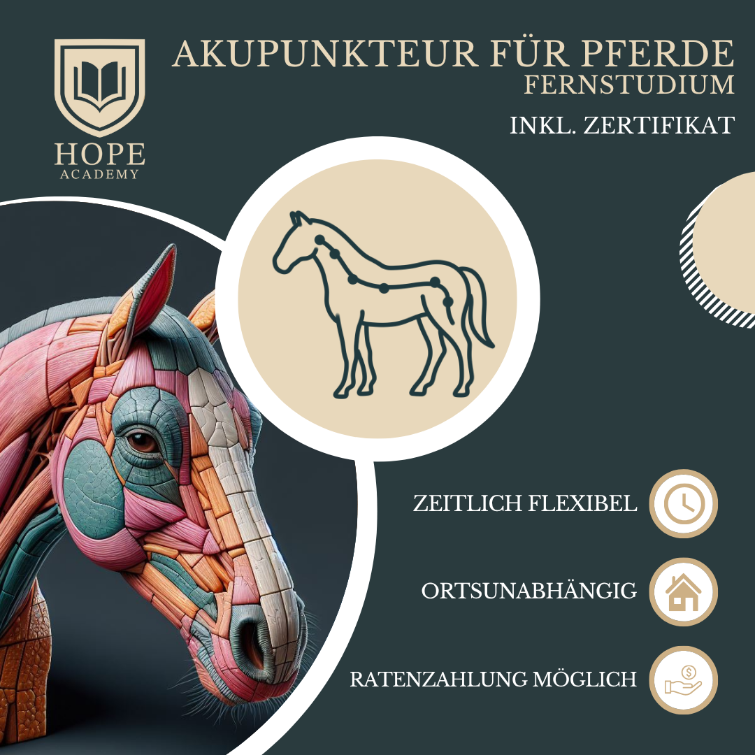 Das Fernstudium Akupunkteur für Pferde der HOPE Academy vermittelt fundierte Kenntnisse über die traditionelle Lehre der Akupunktur in der Anwendung am Pferd. Ziel ist es, Ihnen einen ganzheitlichen Blick auf energetische Prozesse, Regulationsmechanismen und unterstützende Therapiemöglichkeiten zu ermöglichen – basierend auf den Grundprinzipien der Traditionellen Chinesischen Medizin (TCM).