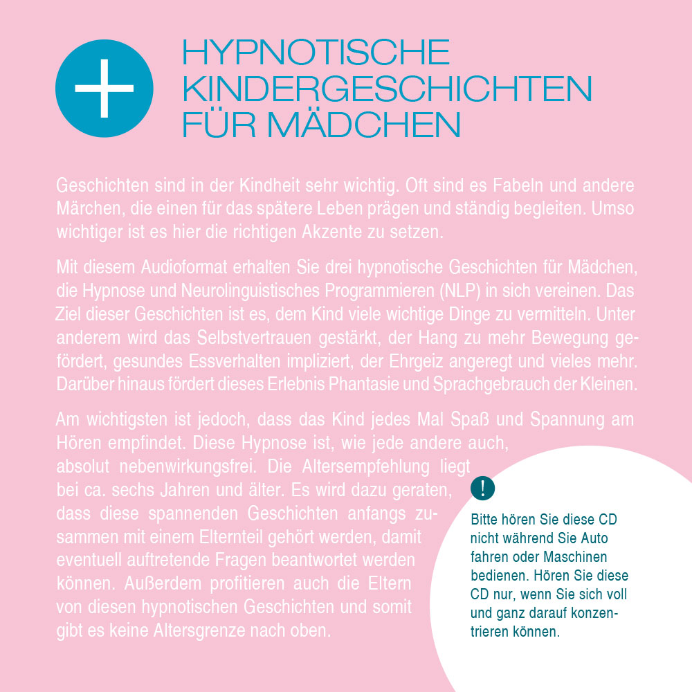- diese Hypnose CD wirkt sich positiv auf schulische Leistung, Essverhalten, Bewegung, Übergewicht, Konzentrationsfähigkeit, Ruhe, Angst und Schlaflosigkeit aus.