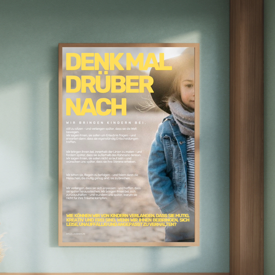 - Der Text auf den Postern ist bewusst gestaltet, um zum Nachdenken anzuregen und die Sicht auf Kindererziehung zu erweitern.
