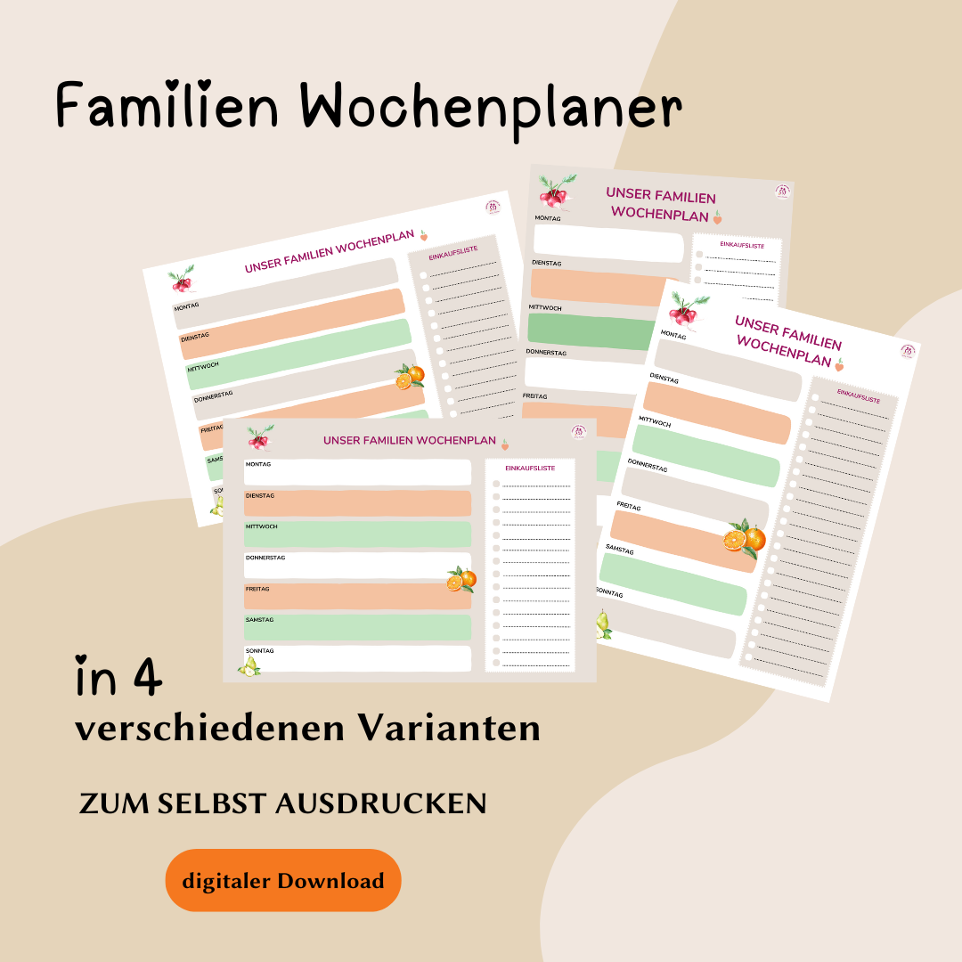 ☀️Familien Wochenplaner im praktischen DIN A4 Format. Du bekommst von mir 4 verschiedene Varianten: