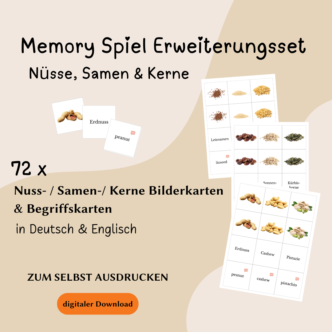 Dieses Erweiterungsset besteht aus insgesamt 72 Memory Karten, die deinem Kind dabei helfen, auf spielerische und interaktive Art und Weise verschiedene Nüsse, Samen & Kerne kennenzulernen und korrekt zu benennen. (deutsch & englisch).