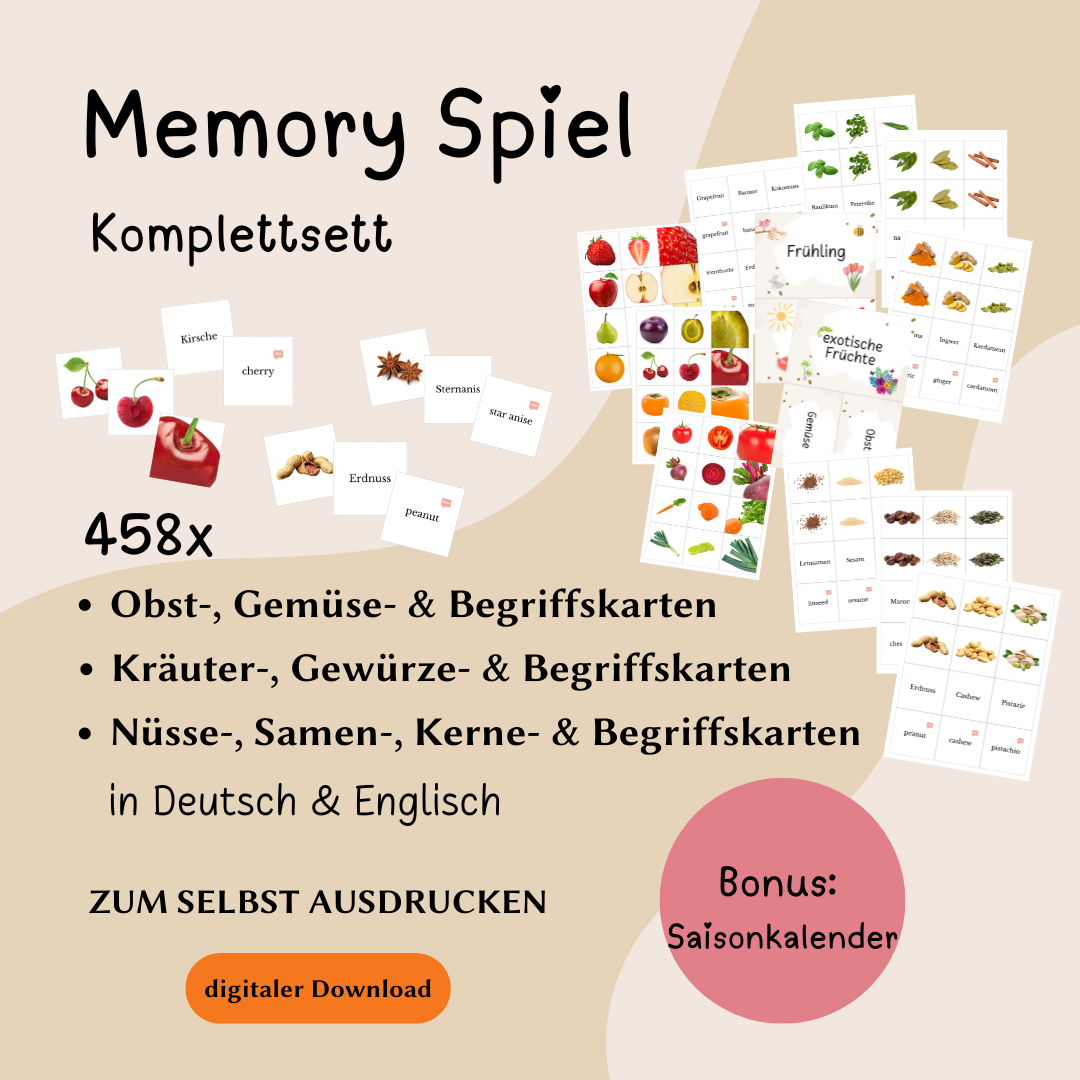 Das Memory Spiel kann deinem Kind dabei helfen, auf spielerische und interaktive Art und Weise verschiedene Obst- & Gemüsesorten, Kräuter & Gewürze sowie Nüsse, Samen & Kerne kennenzulernen.
