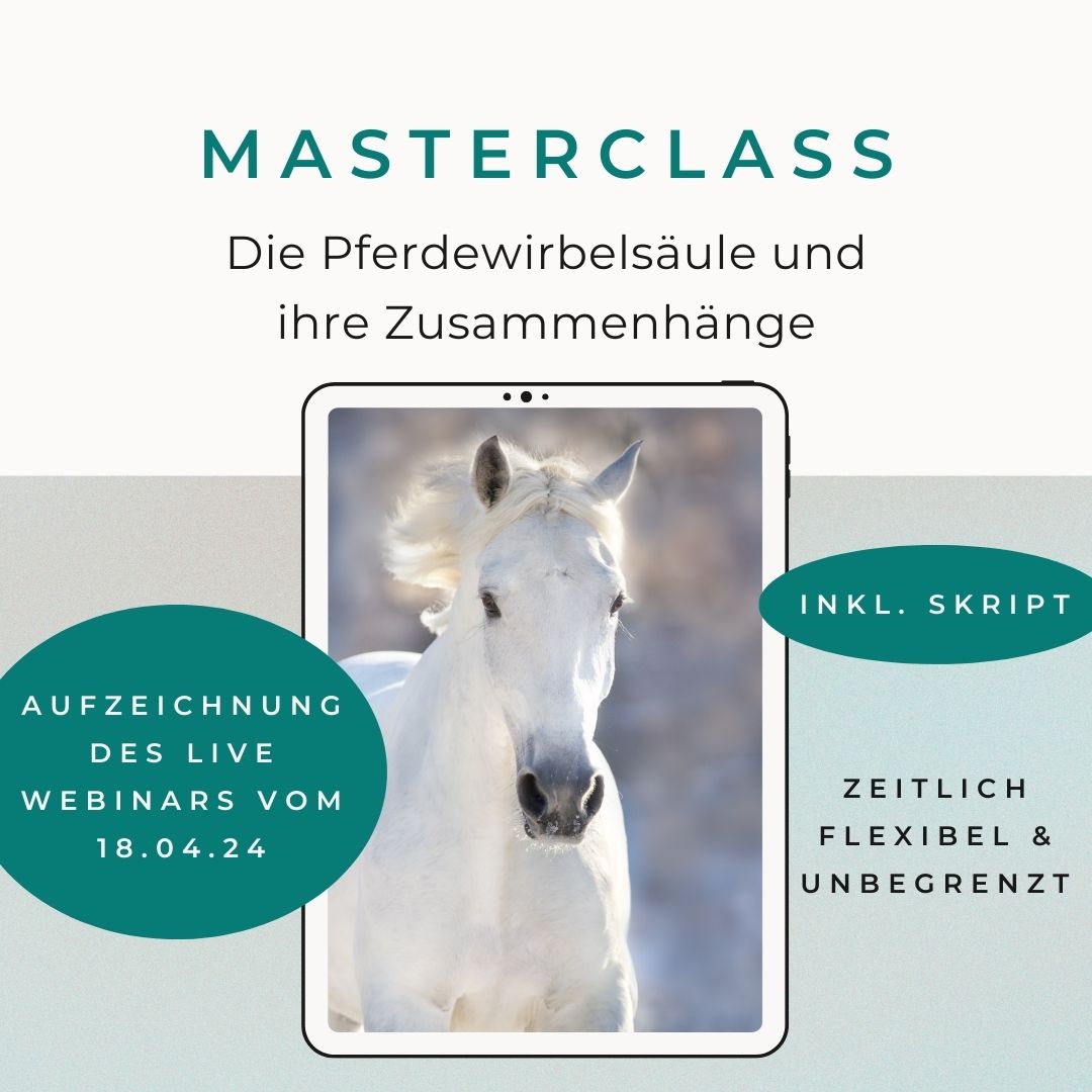 Wusstest du, dass sich Blockierung des siebten Halswirbels auf das Lymphsystem auswirken oder hast du schon einmal vom antiklinaren Bereich der Brustwirbelsäule gehört und warum dieser besonders anfällig für Läsionen ist? In dieser Masterclass widmen wir uns den verschiedenen Abschnitten der Pferdewirbelsäule und ihren anatomischen, physiologischen und energetischen Zusammenhängen. Hierbei handelt es sich um die Aufzeichnung des live-Webinars vom 18.04.2024. Mit der Buchung erhältst du zeitlich unbegrenzten Zugang zur Aufzeichnung sowie dem dazugehörigen Skript.