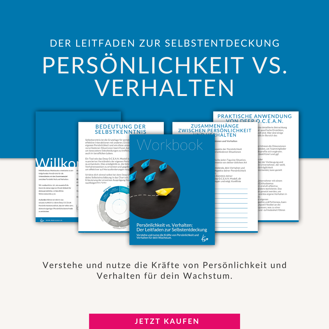 Unser Workbook "Persönlichkeit vs. Verhalten: Der Leitfaden zur Selbstentdeckung" ist der Schlüssel zu tiefer Selbstkenntnis und persönlichem Wachstum. Es führt dich in die Welt des wissenschaftlich fundierten Deep O.C.E.A.N. Modells ein und zeigt dir, wie du die Unterschiede und das Zusammenspiel von Persönlichkeit und Verhalten verstehen und nutzen kannst. Du lernst, warum deine Persönlichkeit der Kern deines Handelns ist und wie du dein Verhalten bewusster steuern kannst, um beruflich und privat erfolgreicher zu sein.