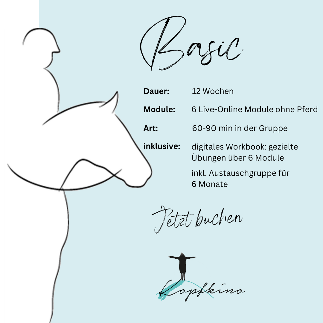 Im Rahmen des Basic-Trainings lernst du die Grundlagen des Mentaltrainings für Reiter. Du lernst, deine eigenen Gedanken und Gefühle sowie ihre Auswirkungen auf dein Pferd bewusst wahrzunehmen. Mithilfe von Übungen beginnst du damit, innere störende Gedanken so zu verändern, dass sie leistungsfördernd werden: