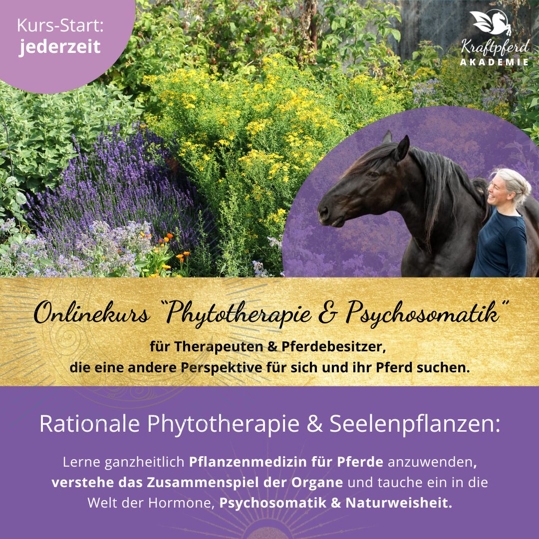 Lerne ganzheitlich Pflanzenmedizin für Pferde anzuwenden, verstehe das Zusammenspiel der Organe und tauche ein in die Welt der Hormone, Psychosomatik & Naturweisheit.