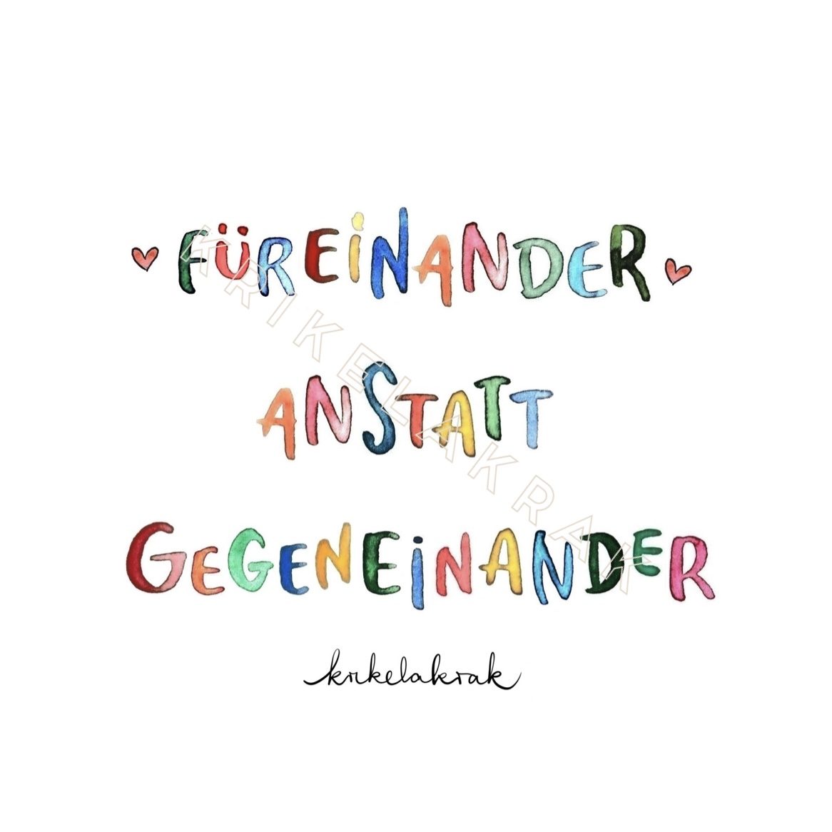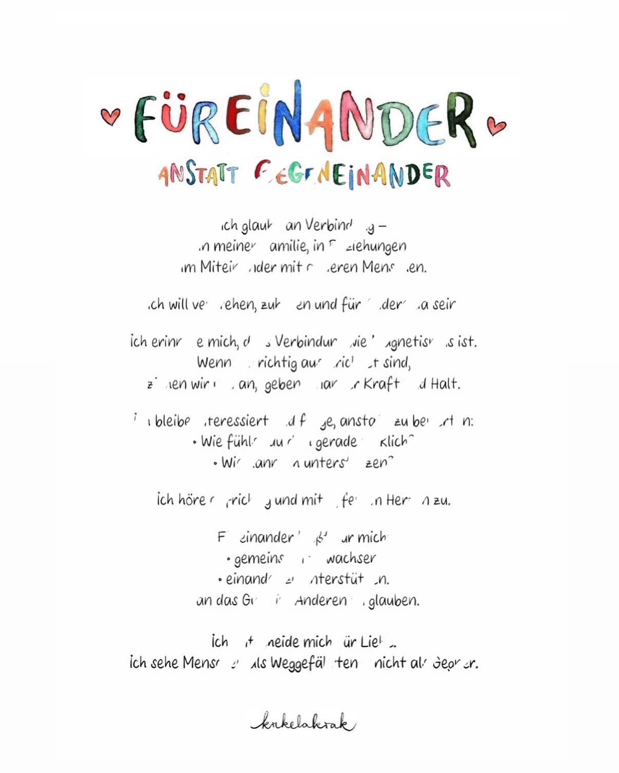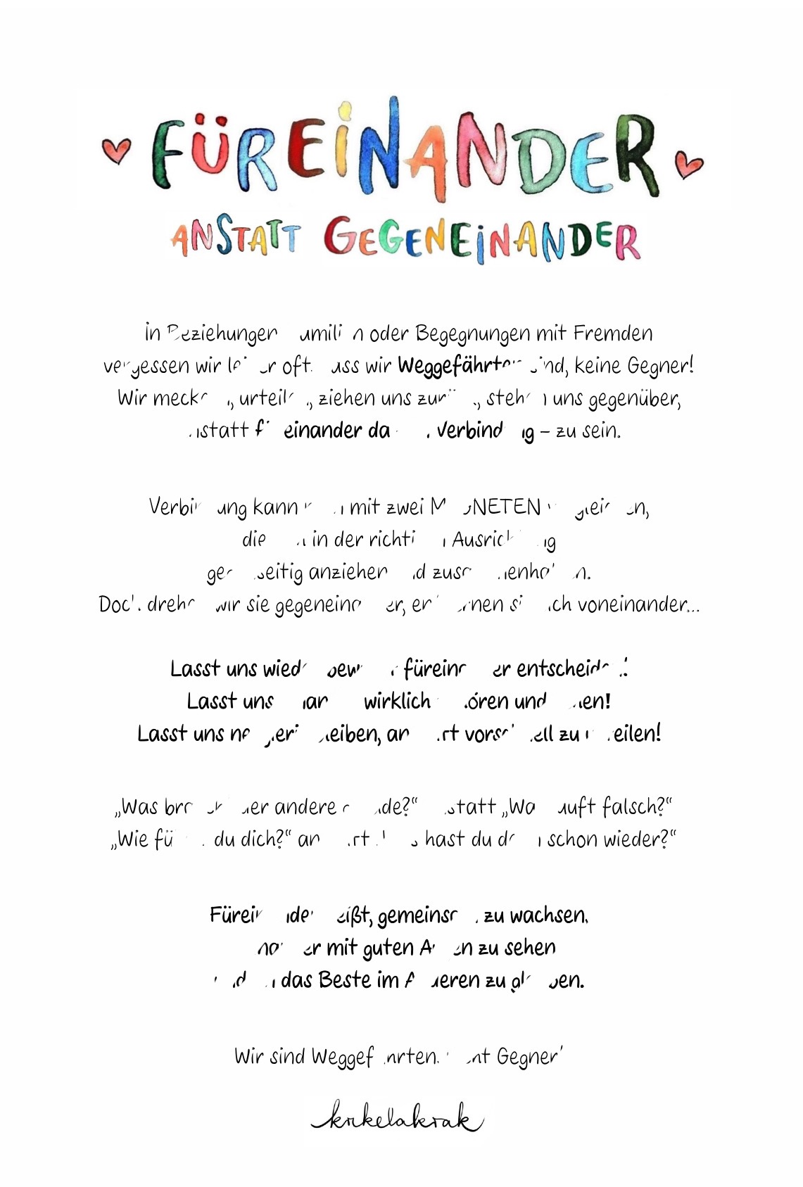 "Füreinander anstatt gegeneinander" (Design, inspirierender Text und Manifest)