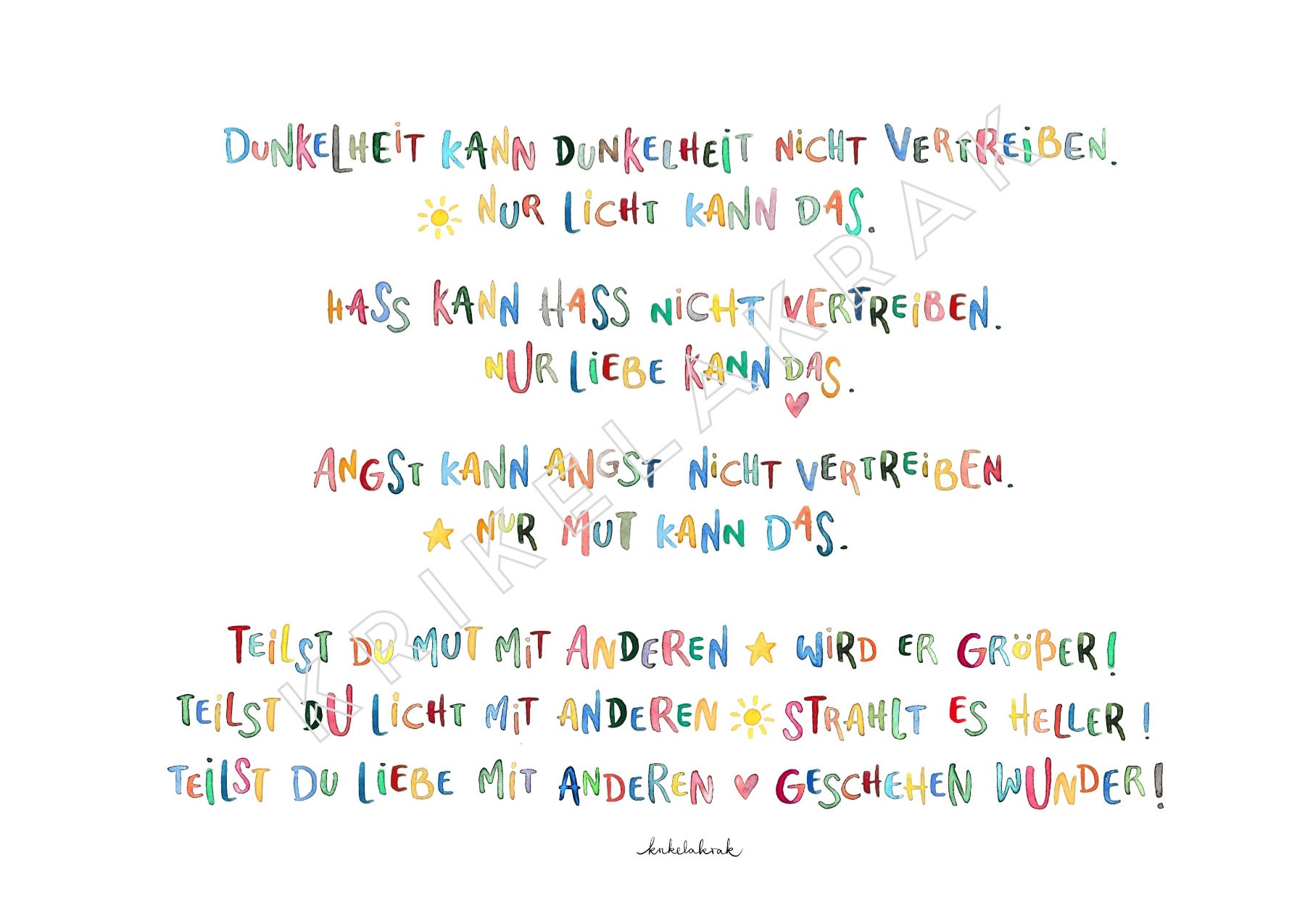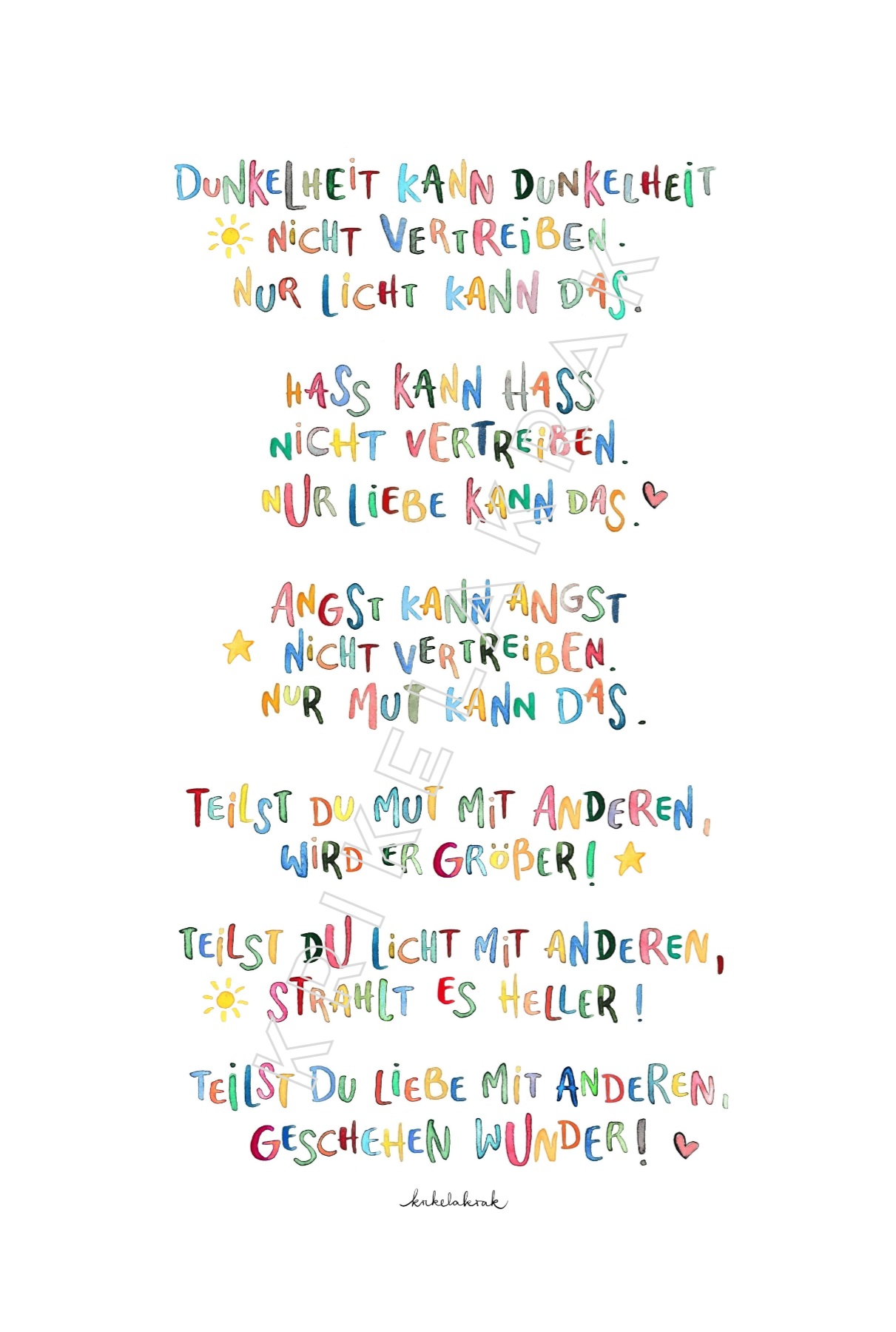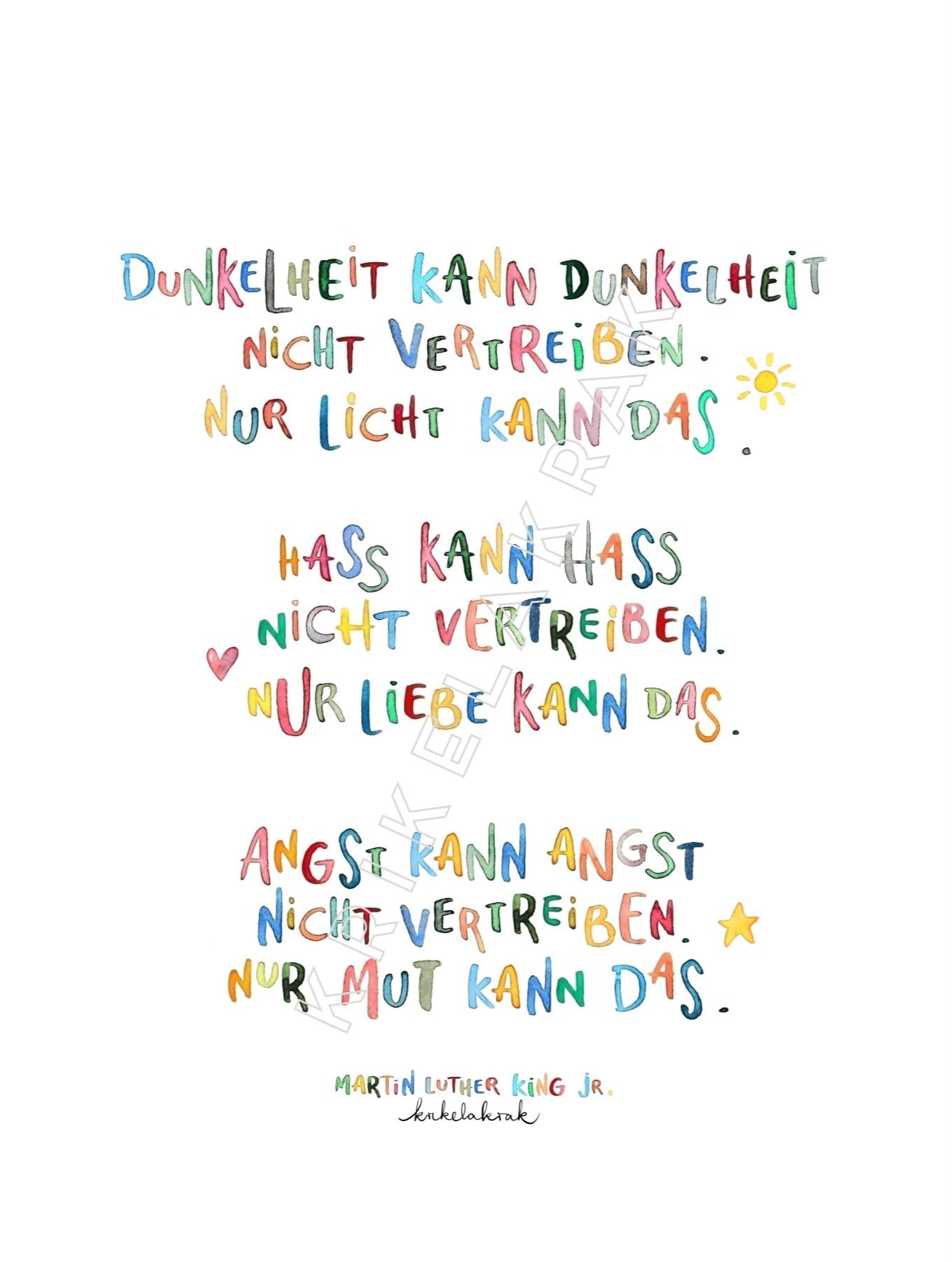 "Dunkelheit kann Dunkelheit nicht vertreiben, nur Licht kann das. Hass kann Hass nicht vertreiben, nur Liebe kann das. Angst kann Angst nicht vertreiben, nur Mut kann das. etc."