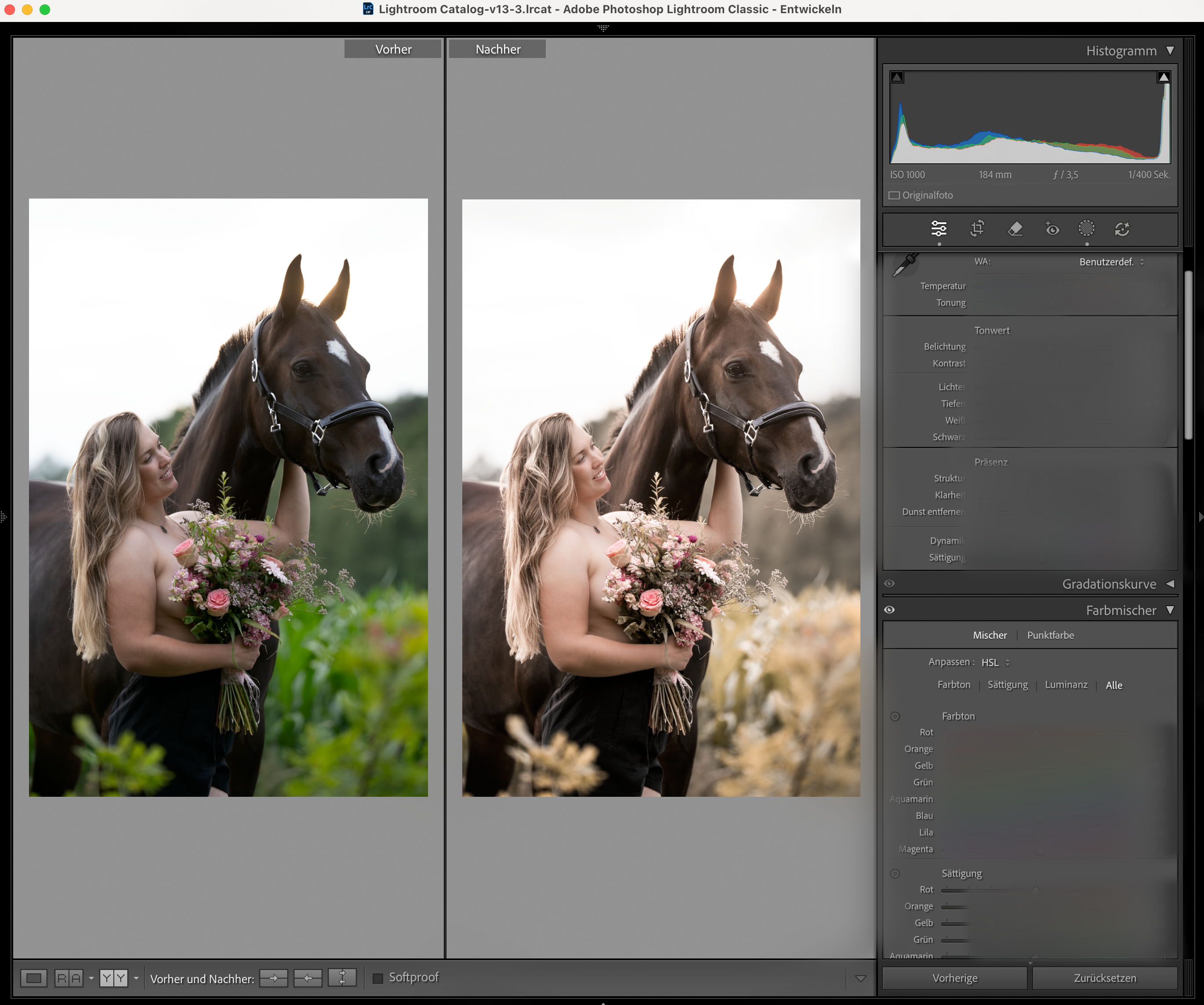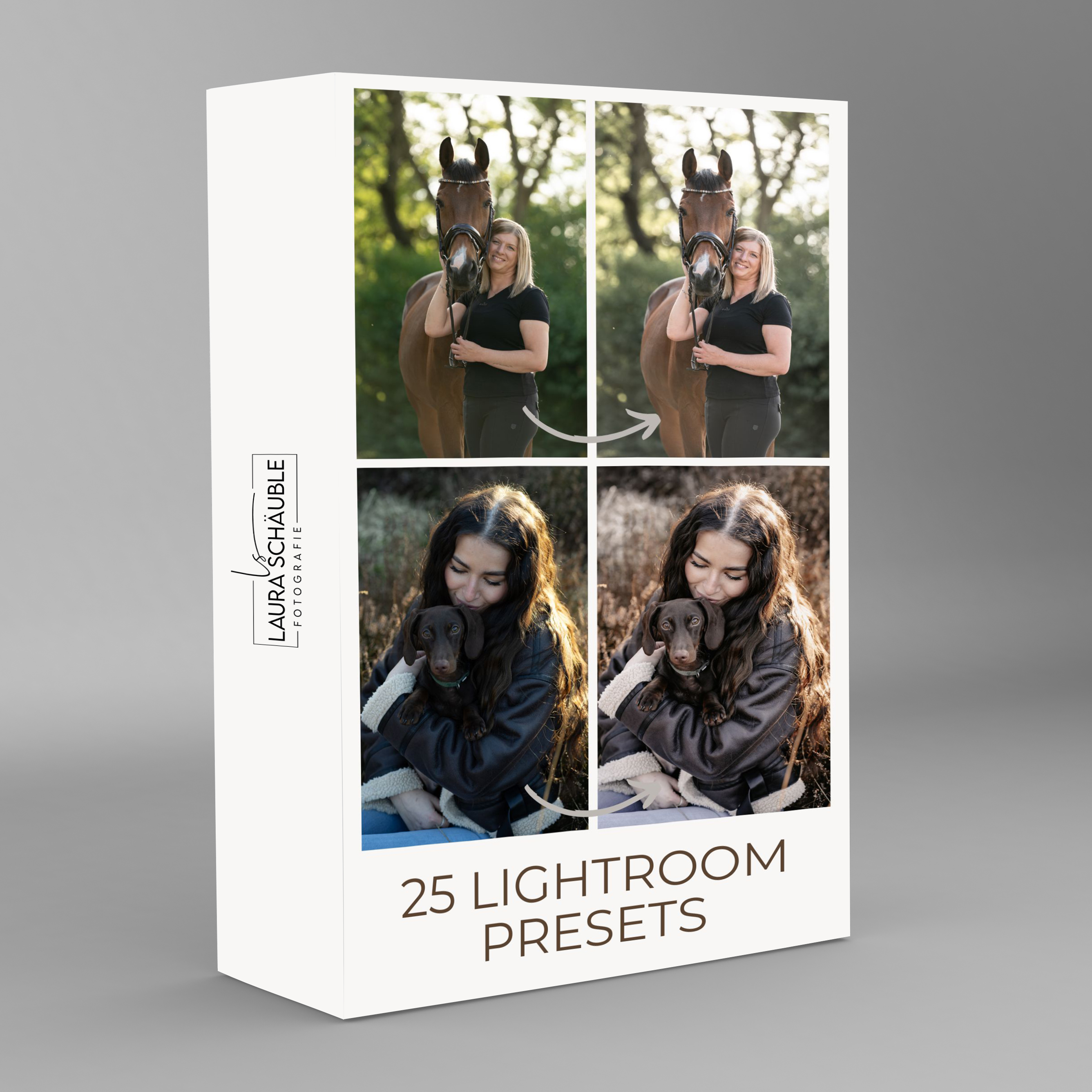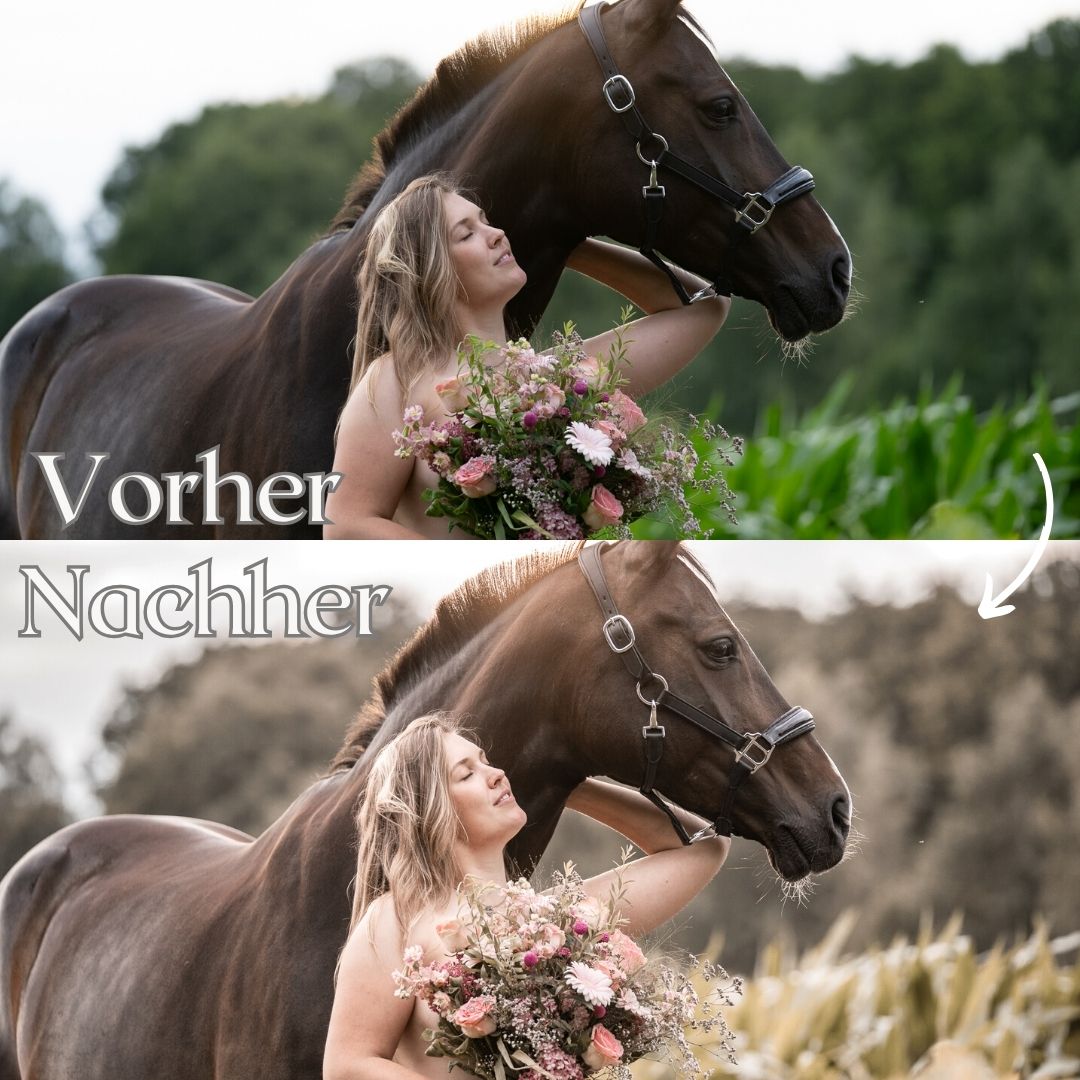 Mit diesen 25 professionellen Lightroom-Presets bekommst du eine schnelle, stimmige und sanfte Bearbeitung für deine Pferdefotos und Hundefotos in verschiedenen Lichtsituationen – ganz ohne nerviges Herumprobieren.