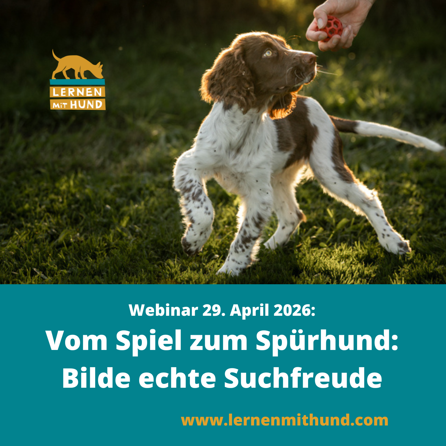 Das Webinar "Vom Spiel zum Spürhund" findet am 29. April 2026 um 19.00 - 21.30 Uhr per Zoom statt (Link wird vor dem Webinar verschickt). Das Webinar wird aufgezeichnet und ist danach für 2 Wochen verfügbar.