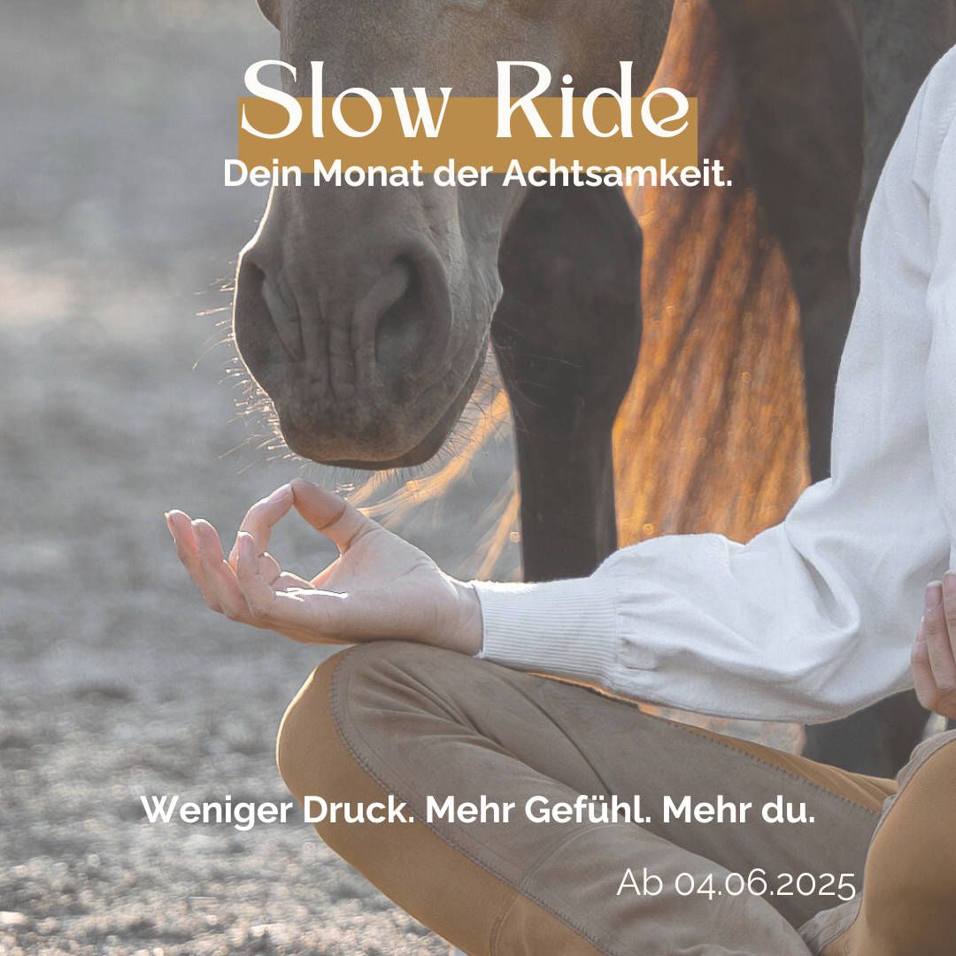 Weniger Druck. Mehr Gefühl. Mehr du.In „Slow Ride“ nehmen wir gemeinsam den Fuß vom Gas – für 30 Tage voller Achtsamkeit, Reflexion und echter Verbindung mit dir selbst und deinem Pferd.