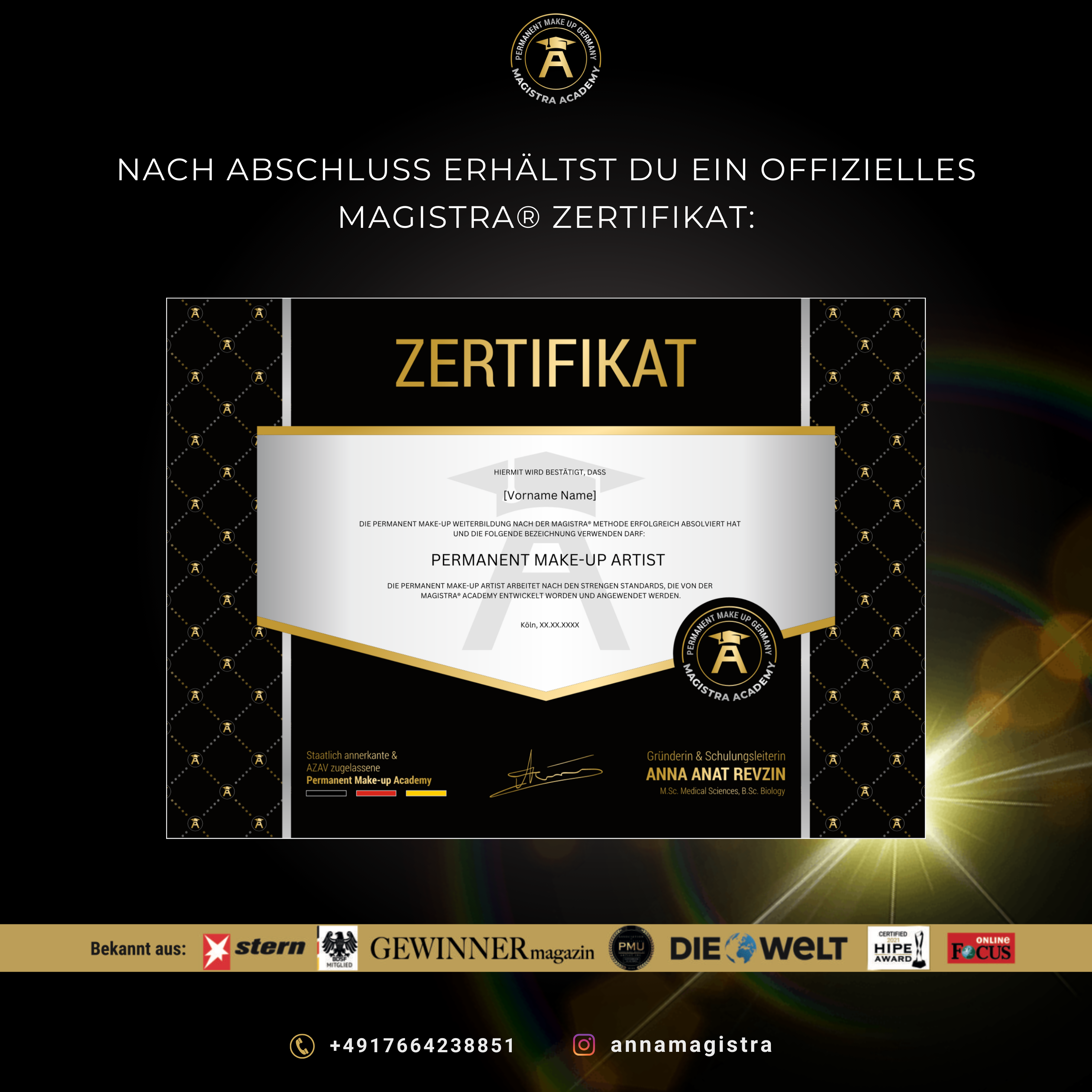 Nach erfolgreichem Abschluss erhältst du ein offizielles MAGISTRA® Zertifikat für alle 3 Augen-Techniken.