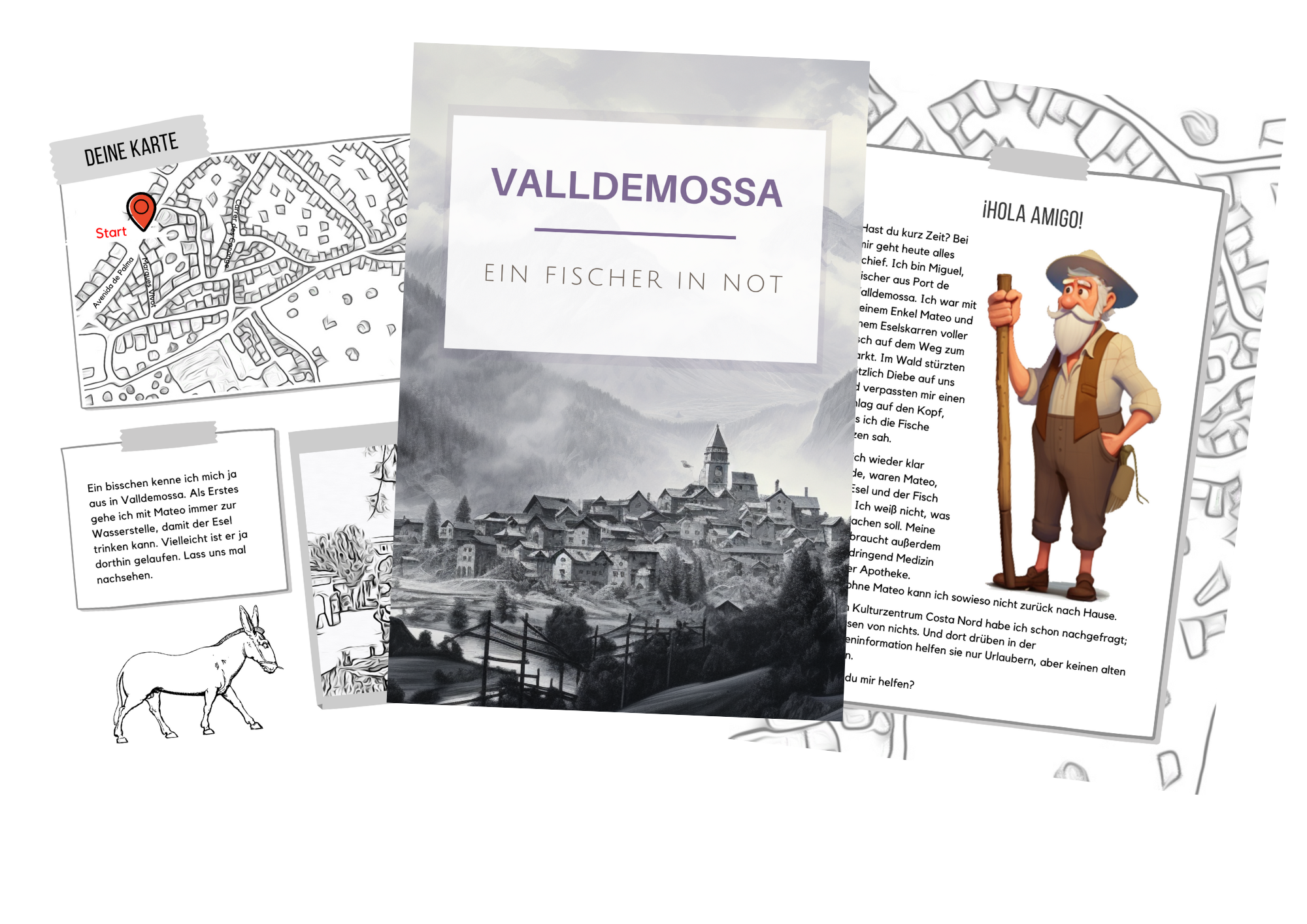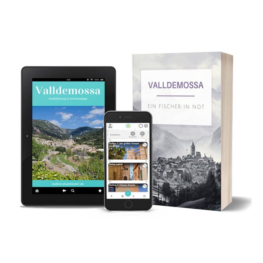 Der Fischer Miguel aus Port de Valldemossa hat einen schlechten Tag: Auf dem Weg zum Markt in Valldemossa wurde er von Banditen überfallen. Jetzt sich nicht nur seine Fische und der Esel verschwunden, sondern auch sein Enkel Mateu, der ihn begleitet hat. Können eure Kinder den alten Mann bei seiner Suche durch Valldemossa helfen?