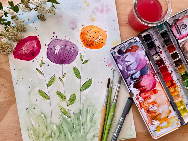 Im Malvideo male ich mit Ihnen ein schönes Blumenbild. Wir werden mit Fineliner und Aquarellfarbe arbeiten. Ich zeige Ihnen, wie spielerisch einfach das Arbeiten mit Aquarellfarbe ist und dabei lassen wir ein wunderschönes Bild entstehen. In Malvideo zeige ich Ihnen viele Tipps und Tricks.