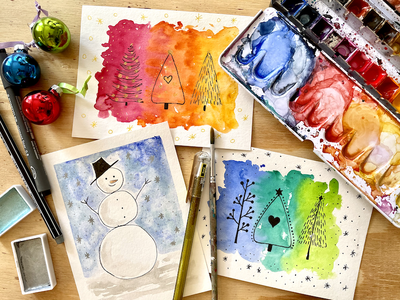 Im Malvideo male ich mit Ihnen zwei wunderschöne Weihnachtskarten. Wir malen einen Schneemann und eine Karte mit abstrakten Weihnachtsbäumen. Lassen Sie uns eintauchen in die Welt der Aquarellfarbe und dabei wunderschöne Weihnachtskarten malen. In Malvideo zeige ich Ihnen viele Tipps und Tricks.