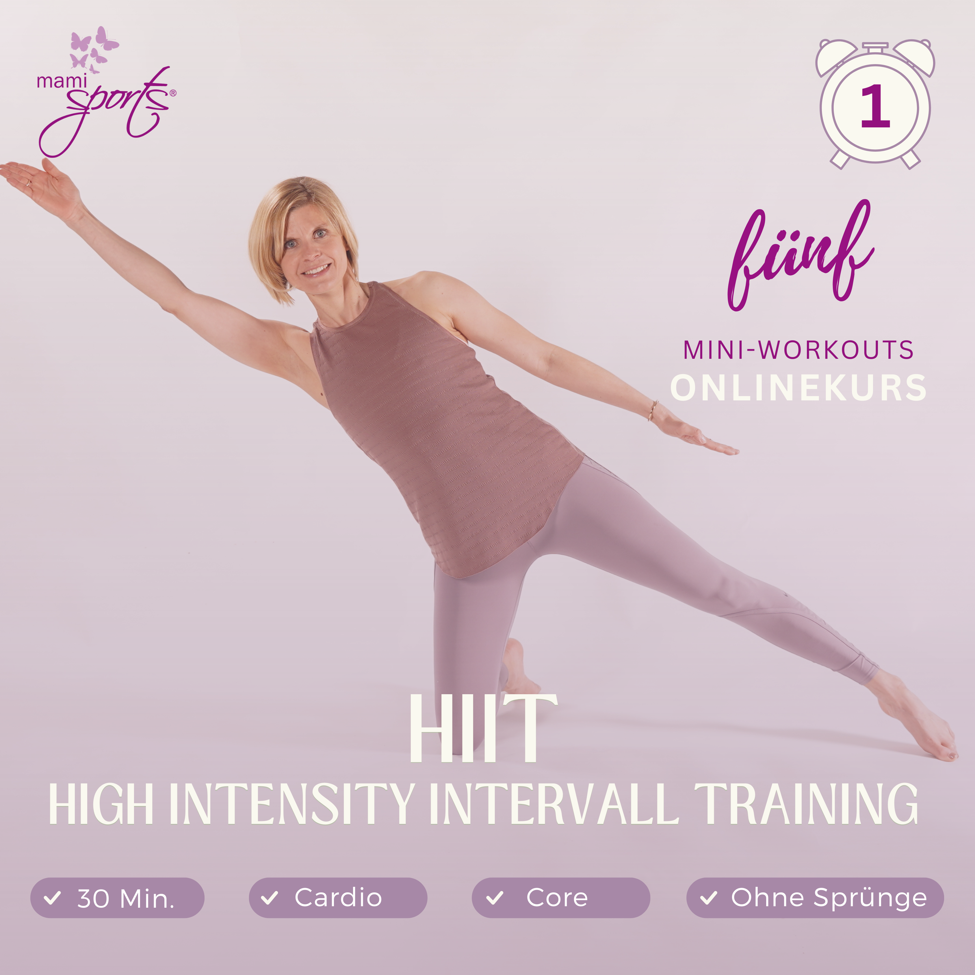 "mami sports HIIT - Cardio und Core" beinhaltet 5 Mini-Workouts à 30 Minuten zum Auspowern und Schwitzen. In jedem Workout werden 3 Zirkel mit abwechslungsreichen Bewegungen erarbeitet, um die Fettverbrennung anzukurbeln und die Körpermitte weiterhin zu stärken. Durch das Aufzeigen vielfältiger Variationsmöglichkeiten kann die Höhe der Intensität von jeder Teilnehmerin selbst gesteuert werden. Alle Bewegungen sind sorgfältig ausgewählt und dem Körper nach Schwangerschaft und Geburt angepasst. Sprünge gibt es in diesen 5 Mini-Workouts keine!