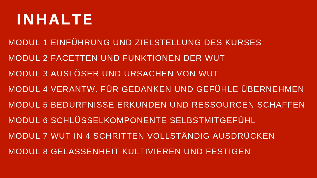 In diesem Online-Kurs lernst du deine Wut konstruktiv zu bewältigen. Du lernst, Frust, Ärger und Wut vollständig auszudrücken, ohne dabei den Menschen in deiner Umgebung weh zu tun. Du lernst, dich mit deiner Wut anzunehmen, als Alternative dazu, sie unterdrücken zu wollen. Du lernst, deine Bedürfnisse unter der Wut besser kennen und sie deiner Umgebung zu kommunizieren. Das wird deine Kommunikation und auch Beziehungen zu deinen Lieben enorm verbessern. Das Resultat sind mehr Gelassenheit, Frieden und Harmonie im Familienalltag (aber auch in allen anderen Lebensbereichen).