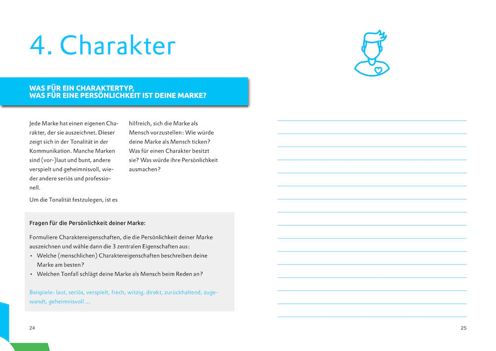 Das BRAND WORKBOOK ist ein Arbeitsbuch mit 34 Seiten im PDF-Format. Es ist für alle geeignet, die selbst an ihrer Marke arbeiten wollen: Freiberufler, Einzelunternehmer*innen. Für den Arbeits