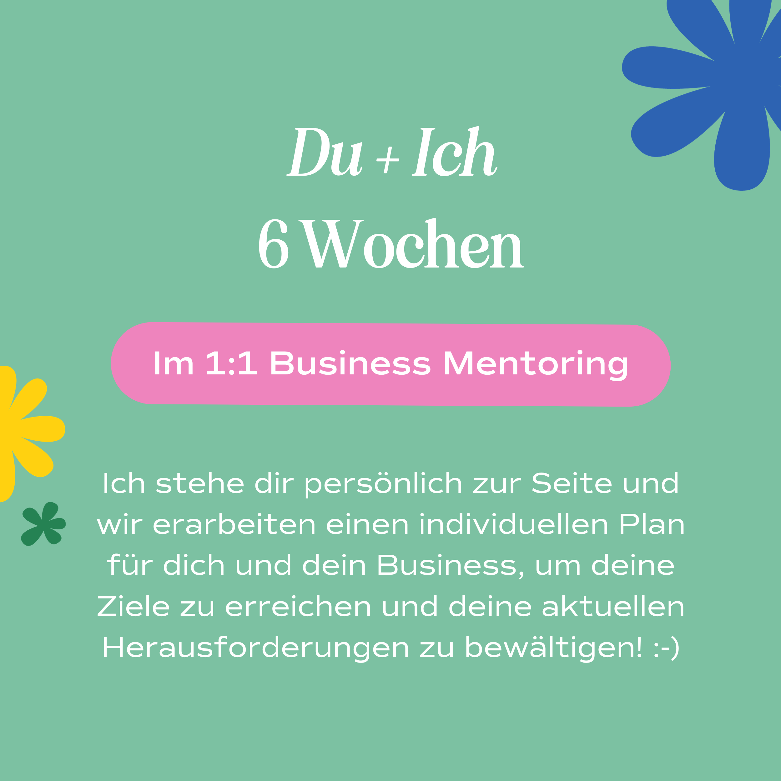 - 6 x 60-75-minütige Beratungsgespräche, in denen du und dein Unternehmen im Rampenlicht stehen