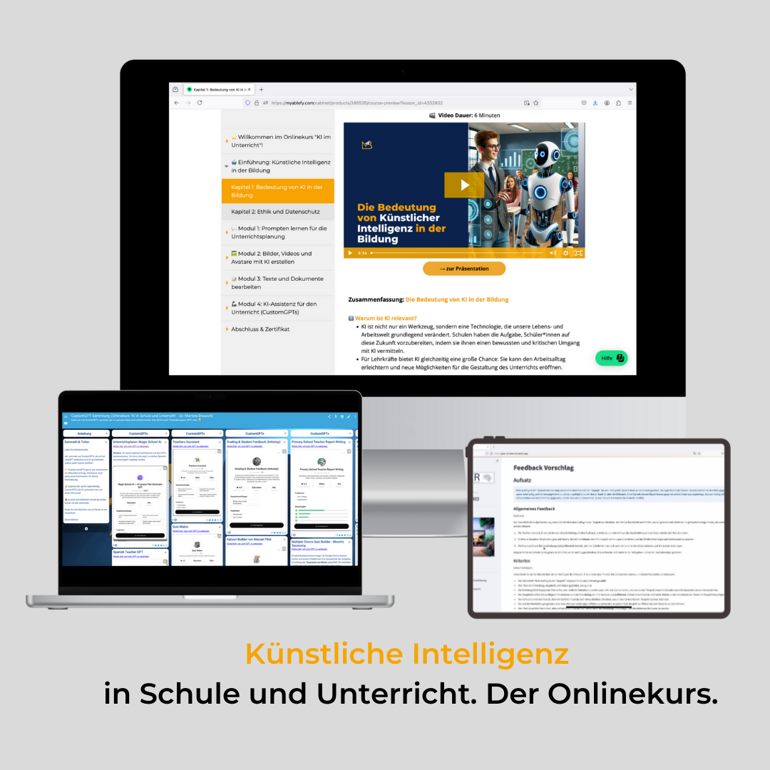 Der Onlinekurs „KI im Unterricht: Praktische Tools und Einsatzmöglichkeiten für Lehrkräfte“ eröffnet Dir kompakte, sofort umsetzbare Einblicke in die Möglichkeiten, wie KI-Tools deine Unterrichtsplanung und -gestaltung bereichern können.