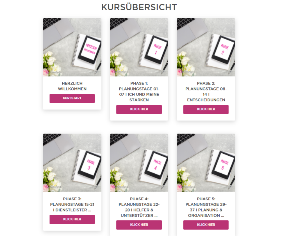 - Ab jetzt Zugriff auf alle Inhalte des Online Kurses mit Schritt-für-Schritt Anleitung zum Hochzeit selbst planen.