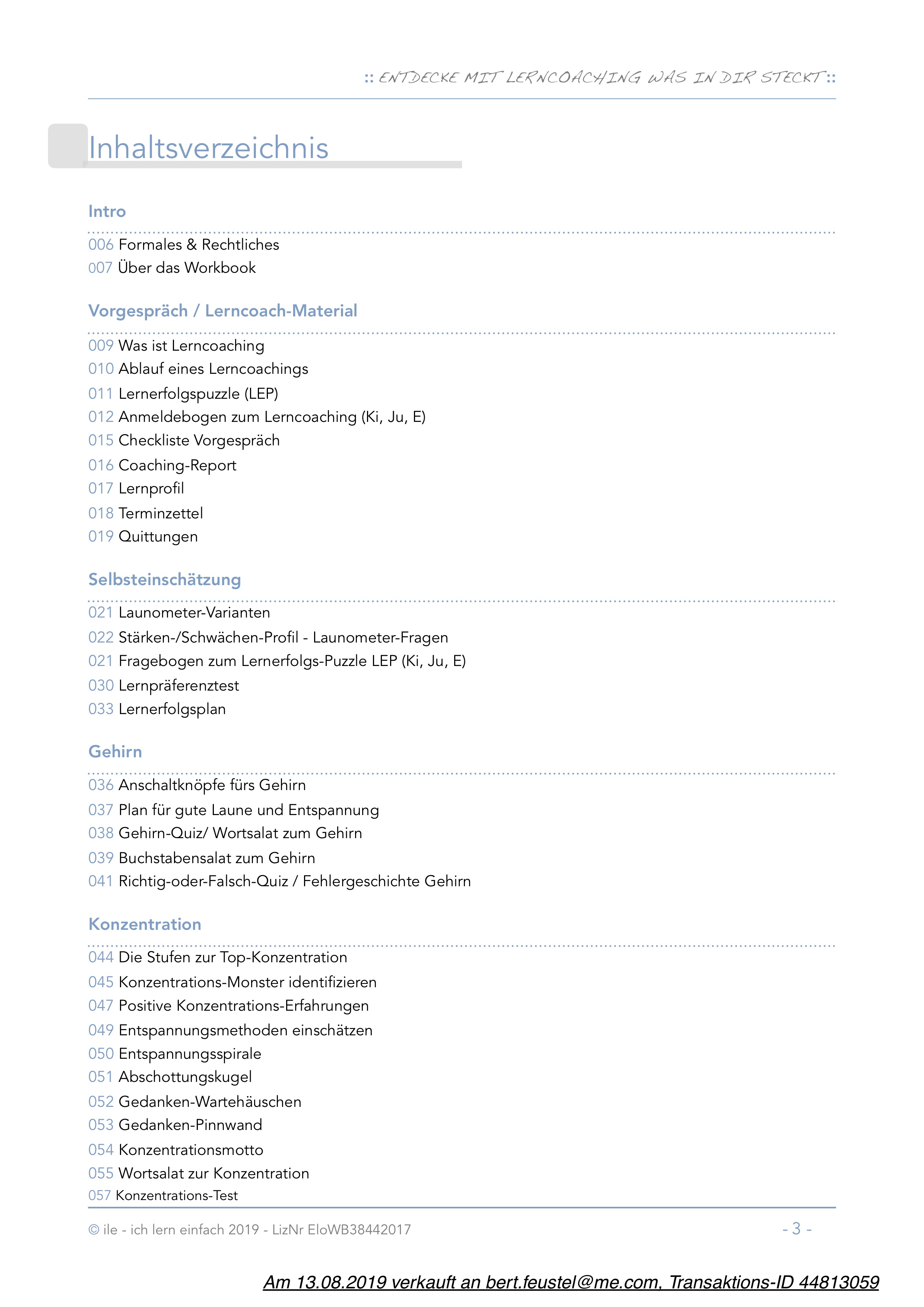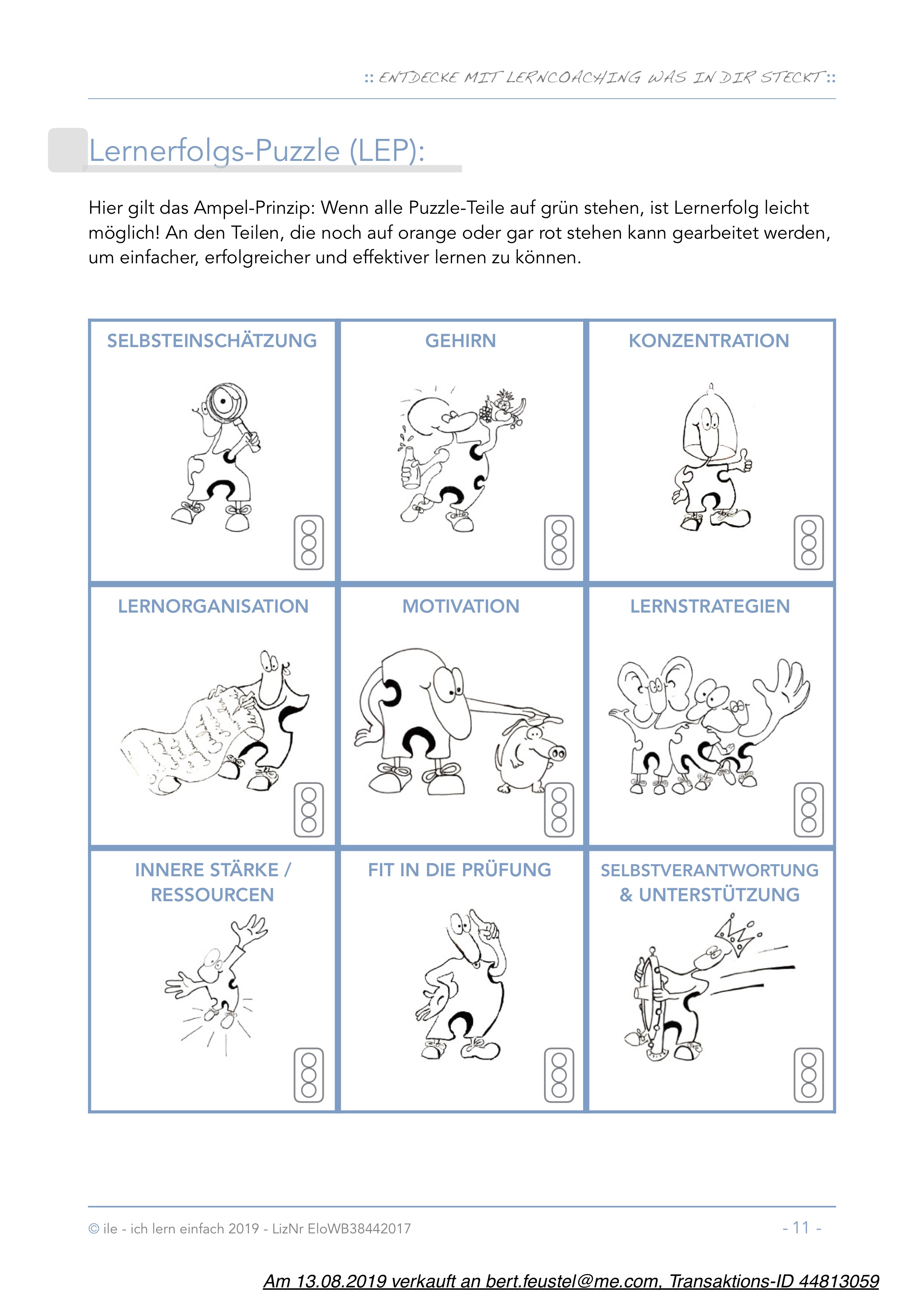 Das Workbook orientiert sich an der Ausbildung zum Lerncoach nach den ILE-Prinzipien. Das heißt, es ist nach dem Lernerfolgspuzzle aufgebaut. Ausgebildete Lerncoaches kennen die Bedeutung des Materials und wissen es an der richtigen Stelle einzusetzen.