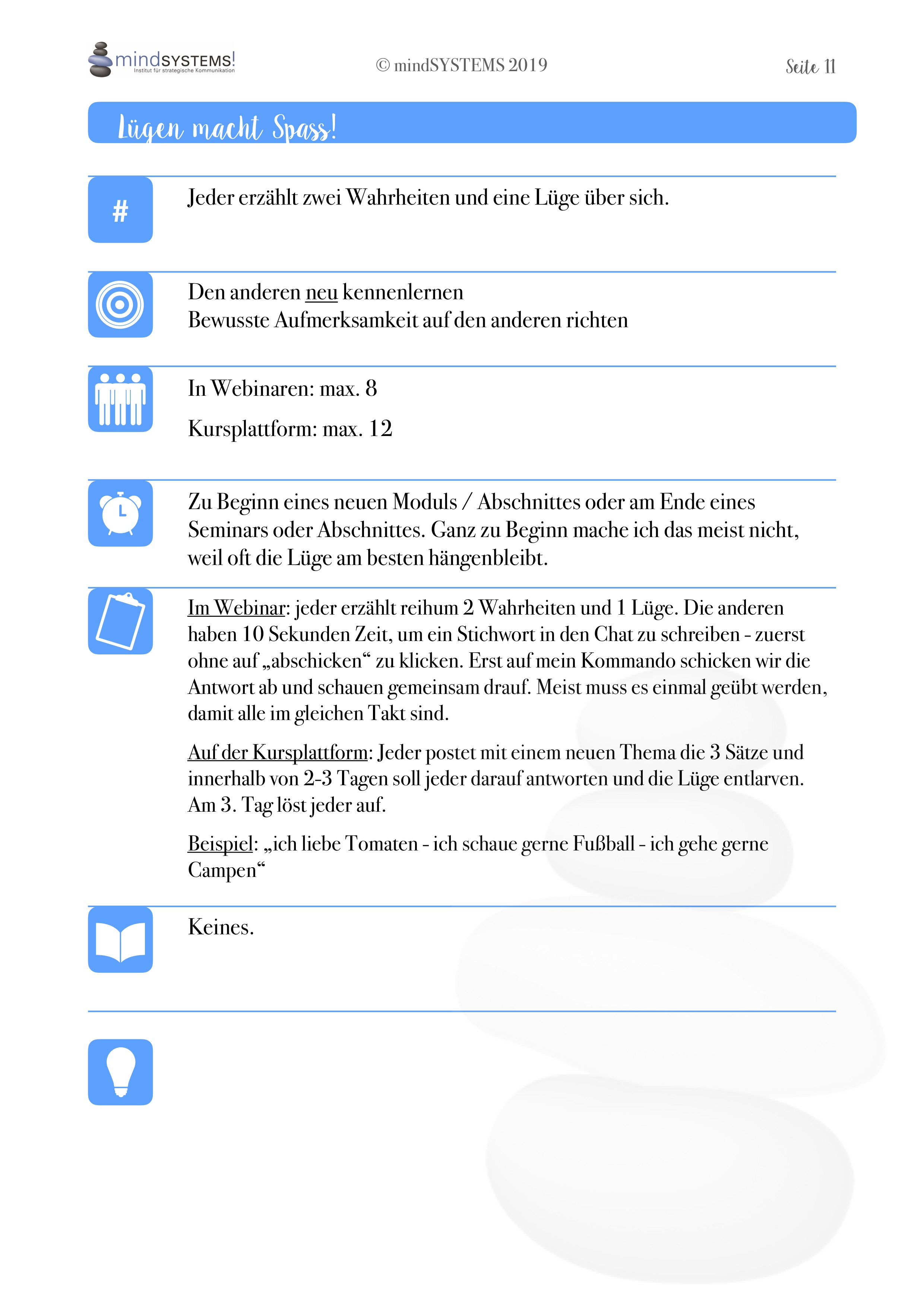 Die vorgestellten Methoden sind abwechslungsreich, überraschend und für jede Zielgruppe geeignet. Sie sind übersichtlich dargestellt und leiten dich als Online TrainerIn durch den Prozess.