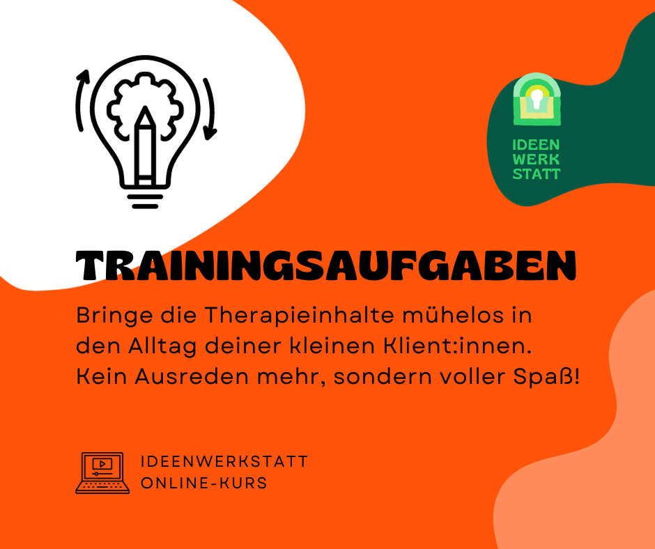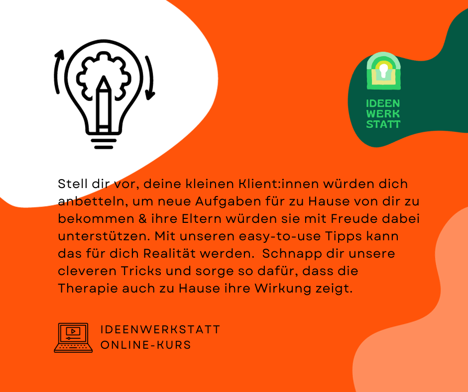 Die Ideenwerkstatt "Ergotherapeutische Trainingsaufgaben" ist ein Video-Kurs für Therapeut:innen, der dir zeigt, wie du die Förderung des Kindes in den Alltag der Familien integrierst, ohne einen Mehraufwand zu schaffen, um so begeisterte Familien zu haben, die mehr statt weniger Aufgaben wollen.