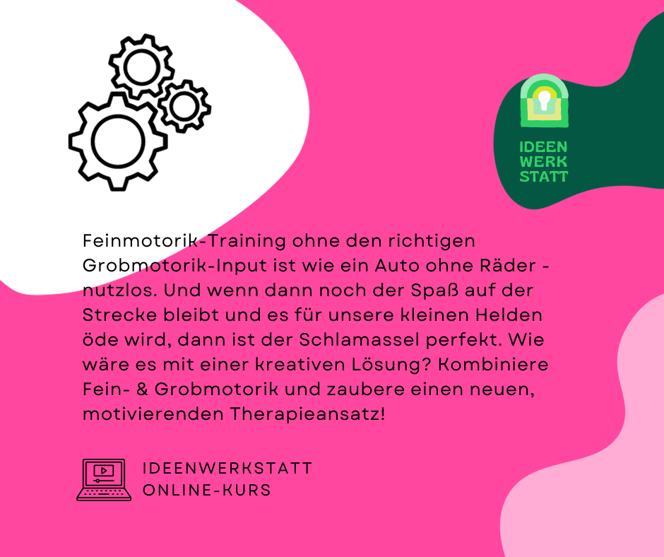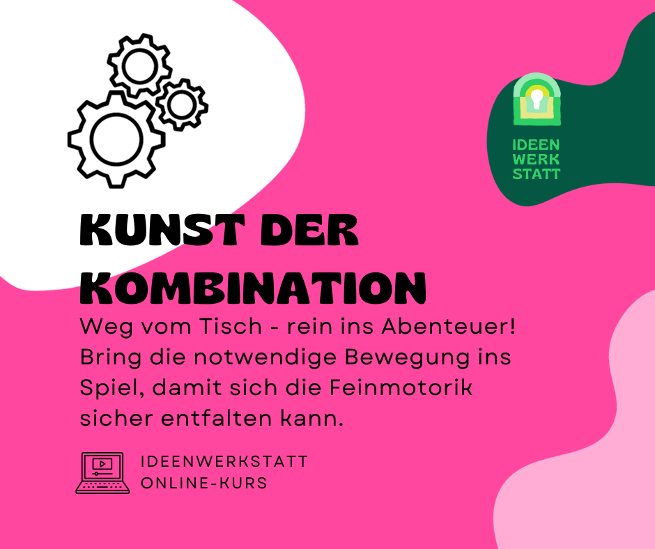 Die Ideenwerkstatt Kunst der Kombination ist ein Video-Kurs für Therapeut:innen, der dir zeigt, wie du Fein- und Grobmotorik in der Therapie verbindest, um so Ideen zu schaffen, die das Kind begeistern und zum Feinmotorik-Training motivieren.