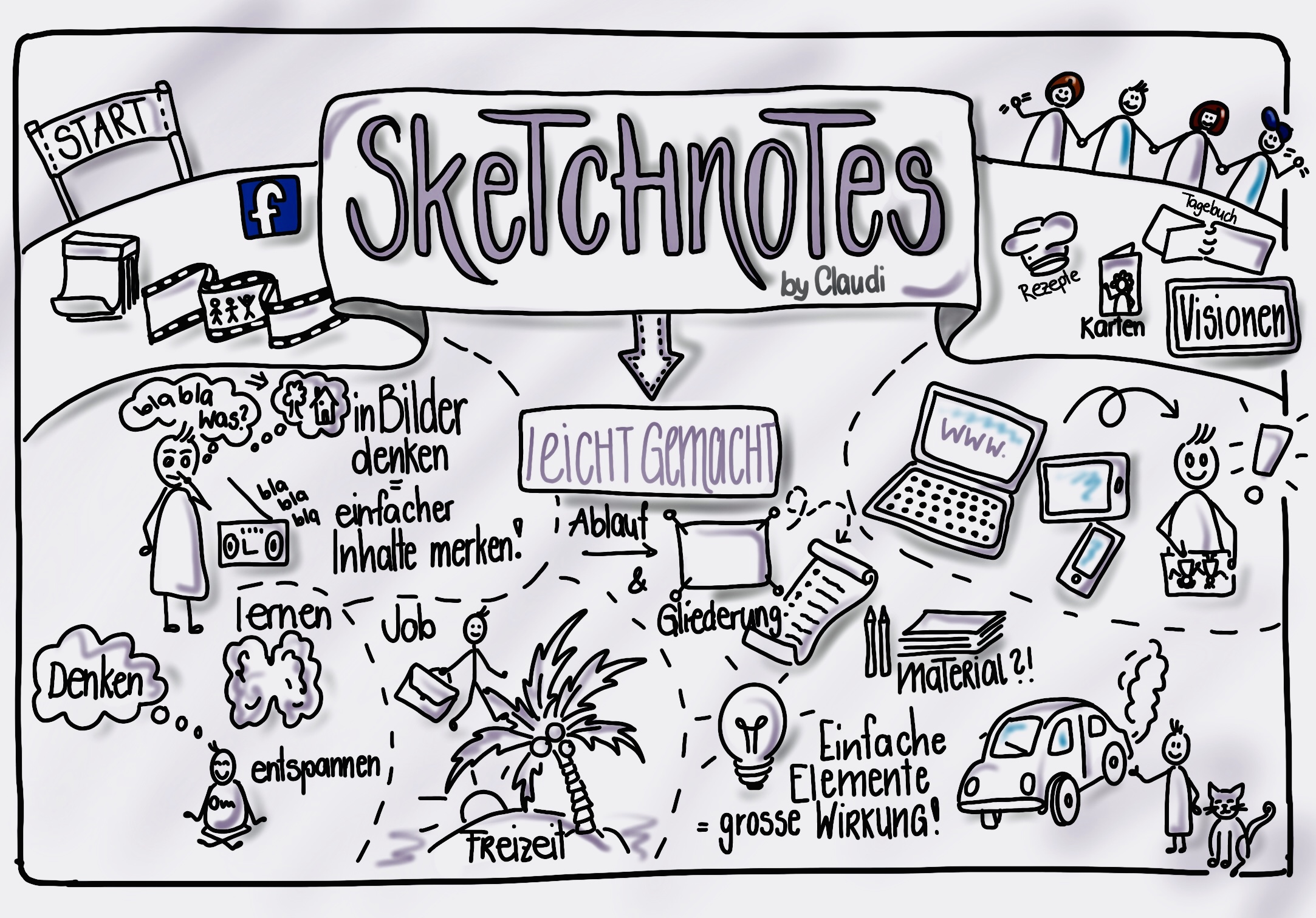 Sketchnotes sind gezeichnete Notizen. Sie können alternativ zu geschrieben Texten eingesetzt werden. Da wir in Bilder denken, helfen Sketchnotes Inhalte zu visualisieren und Du kannst Dir Neues besser merken.