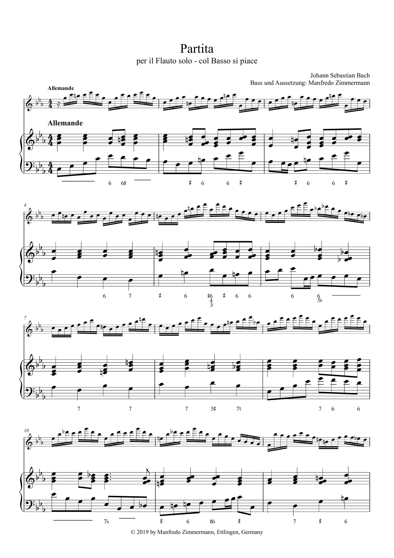 This special version of the famous Partita wants to give a new view of this master piece with a bass-line composed for it. Structures, harmony, phrases and motifs can be recognized and understood better and perhaps in a new way. The newly created bass is based on the basic requirements for a basso continuo of the 18th century and in particular on the basses of J.S. Bach in his various sonatas, suites and partitas.