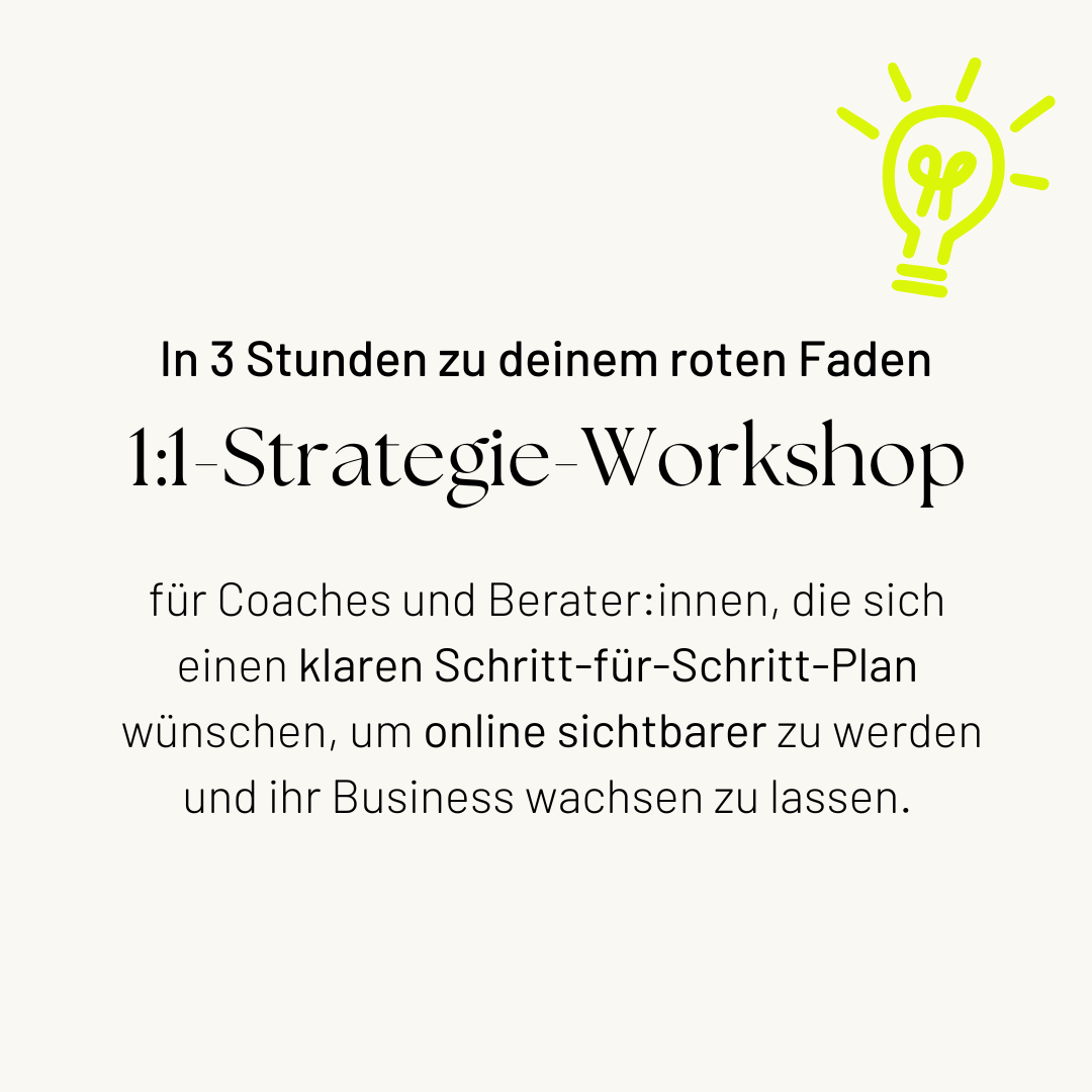 Buch dir einen 1:1-Strategie-Workshop und entwickle mit mir deine individuelle Marketing-Strategie, damit du online sichtbarer wirst, neue Kund:innen begeisterst - und immer genau weißt, was du als Nächstes tun solltest.
