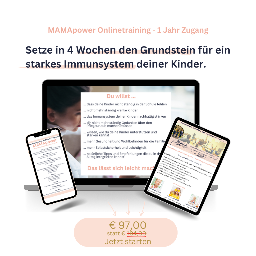 In MAMApower bekommst du Handwerkzeug und Wissen rund um die Konstitution und Diagnostik. Auswertungen, Rezepte, Tipps und Empfehlungen, kannst du sofort in deinen Mama Alltag integrieren. Kleine Änderungen - große Wirkung! Professionelle Tipps und Unterlagen unterstützen dich dabei, deine Kinder besser zu verstehen und bestmöglich zu begleiten und zu stärken. MAMApower ist dein erste Schritt zur Stärkung des Immunsystems deiner Kinder.