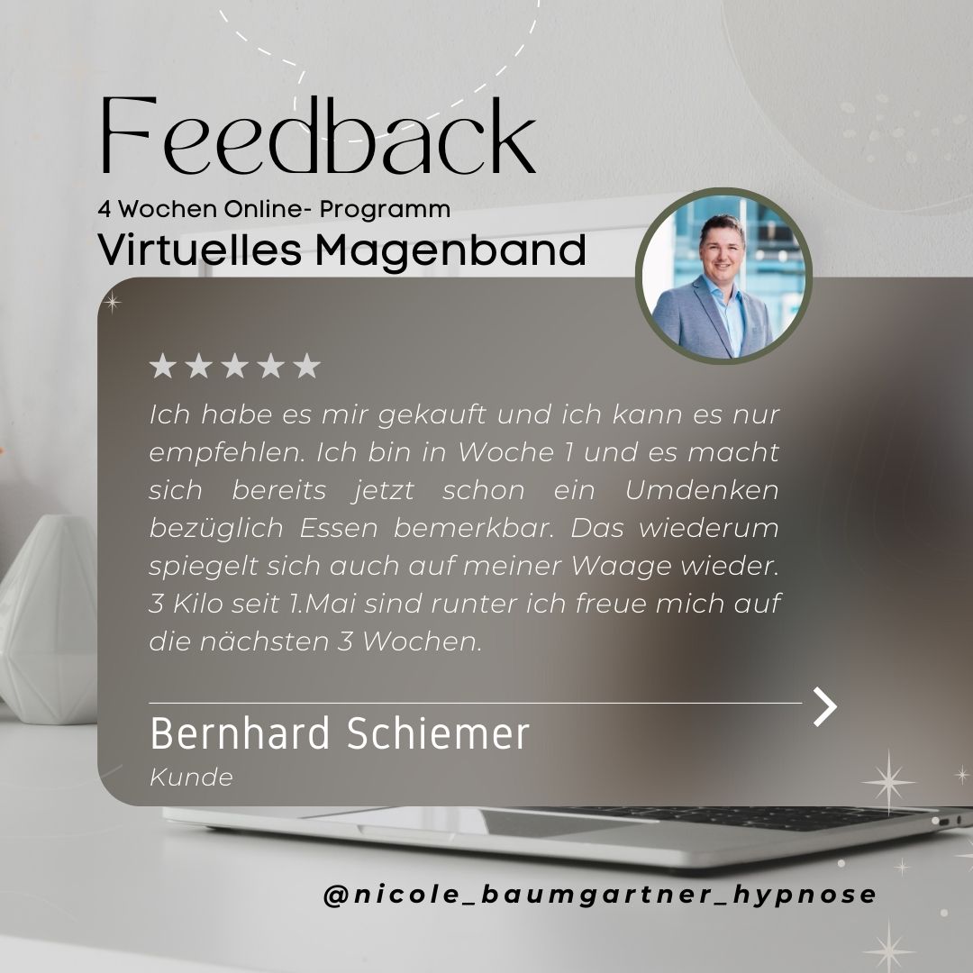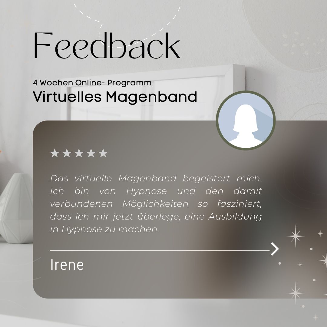 Das Virtuelle Magenband-Programm der englischen Hypnose-Ikone Sheila Granger ist nun erstmalig, mit der Hypnose-Expertin Nicole Baumgartner, als Online-Begleitprogramm erhältlich. Nicole ist die einzige deutschsprachige Trainerin von Sheila Granger und hat in vielen Jahren Praxistätigkeit schon hunderte von Menschen in ein leichteres Leben begleitet. Bekanntheit erlangte die Hypnosetherapeuting vorallem durch die unzähligen positiven Erfahrungen ihrer Klienten, Auftritt in TV, Podcasts oder spannenden Hypnoseexperimenten auf Youtube.