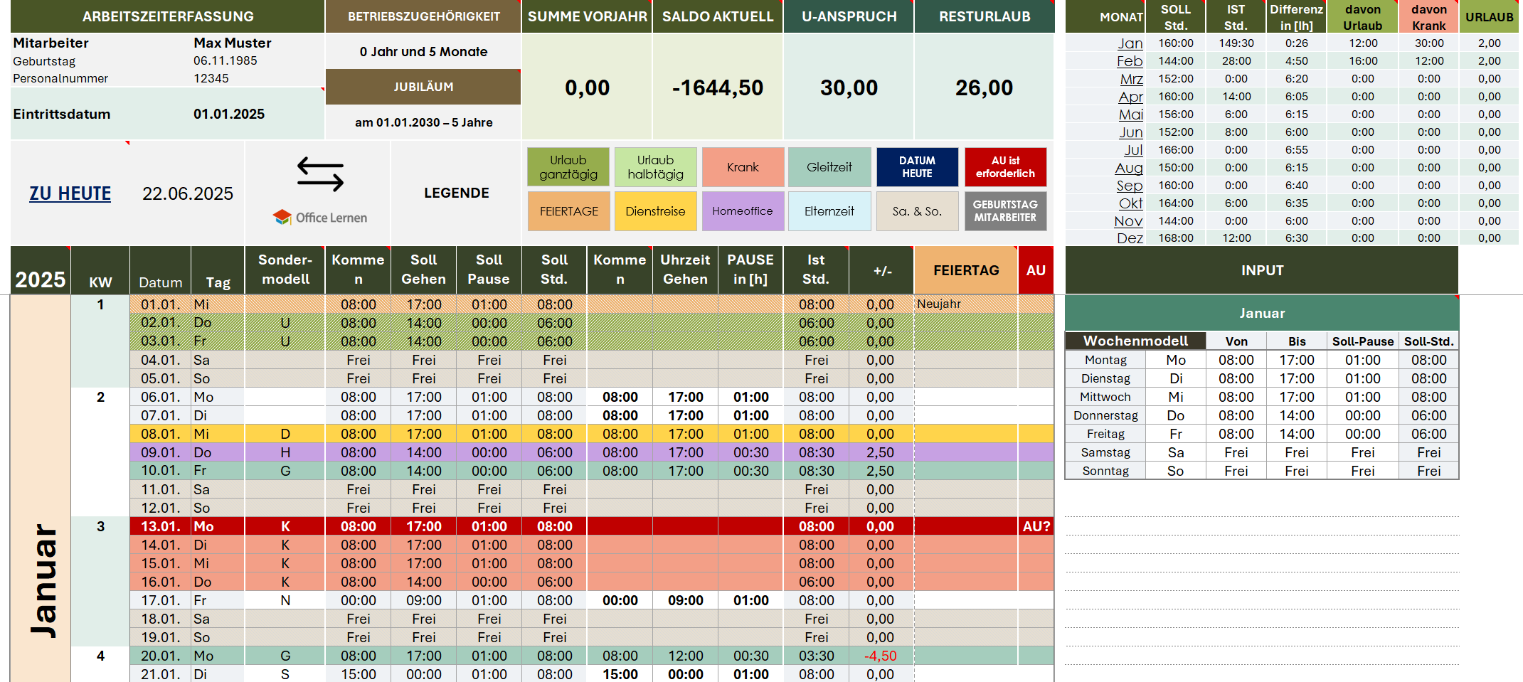 - Jahresübersicht: bringt Struktur, Überblick und ermöglicht langfristige Auswertungen. Zeigt auf einen Blick alle Monate, Soll-/Ist-Stunden, Überstunden, Urlaubstage, Krankheitsstunden. Springen zu dem aktuellen Monat per Mausklick möglich. Urlaubssalden und Resturlaub sofort erkennbar. Alle Berechnungen werden ab Eintrittsdatum angezeigt.