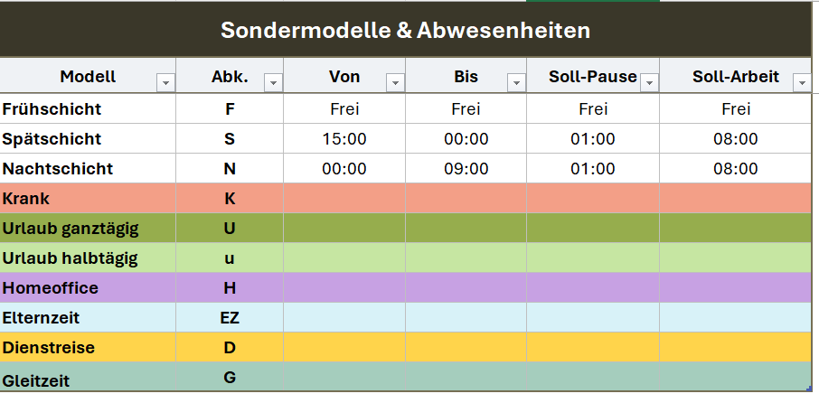 - Sondermodell: bietet viele praktische und organisatorische Vorteile. Die von Ihnen vordefinierten Abkürzungen zu den Schichten & Abwesenheiten können anschließend im Stundenzettel per Dropdown ausgewählt werden (z. B. „Urlaub“, „Krank“, „Frühschicht“, „Homeoffice“) – keine Freitexteingabe nötig. Sobald eine Abwesenheit (z. B. „Krank“) oder eine Schichtart (z. B. „Nachtschicht“) ausgewählt wird, werden die Sollzeiten automatisch angepasst – je nach Wochenmodell.