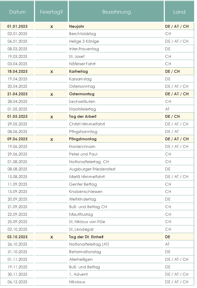 - Feiertage: Öffentliche Feiertage (DE, AT, CH) oder spezielle Tage können im Stundenzettel berücksichtigt werden. Bezeichnungen von Feiertagen wird im Kalender angezeigt.