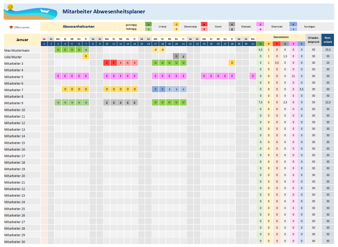 Abwesenheitsplaner 2024 für Microsoft Excel