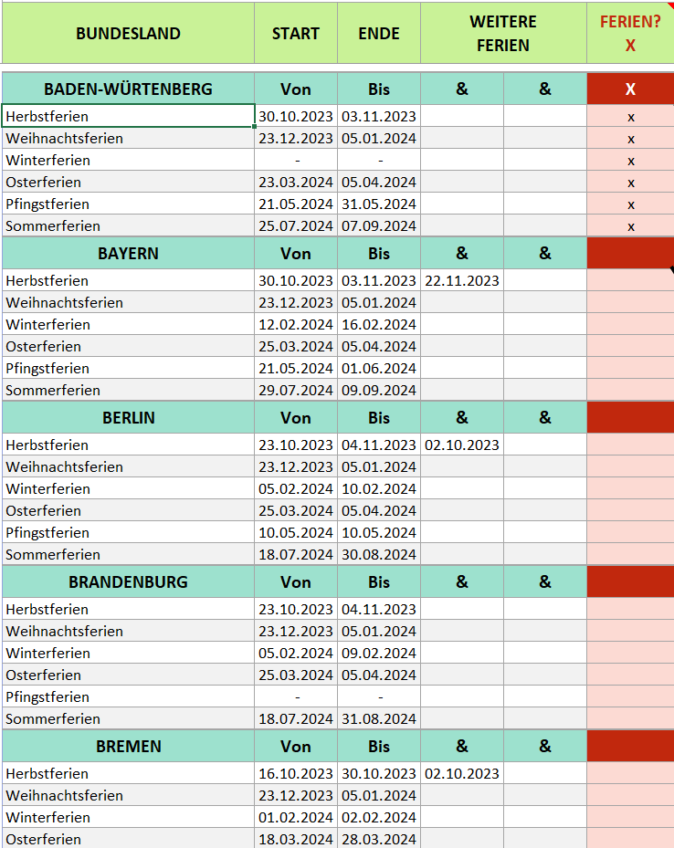 Die Schulferien für das gewünschte Bundesland werden farbig markiert.